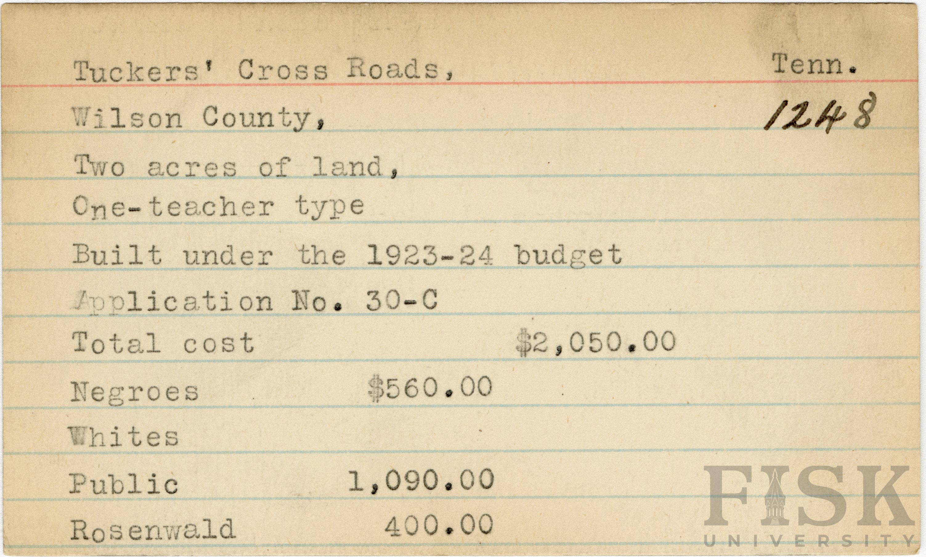 - School card from Rosenwald Fund for Tucker's Cross Roads School in Wilson County, Tennessee