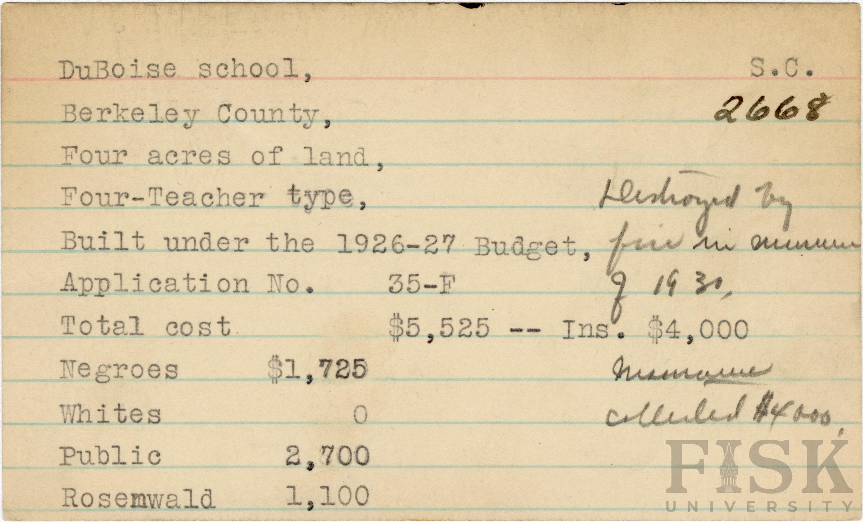- School card from Rosenwald Fund for DuBoise School in Berkeley County, South Carolina with a section added to the budget contributions that says, "Ins. $4,000" and handwritten notes on the card that says, "Destroyed by fire in [unclear] of 1930" and "Insurance collected $4,000"