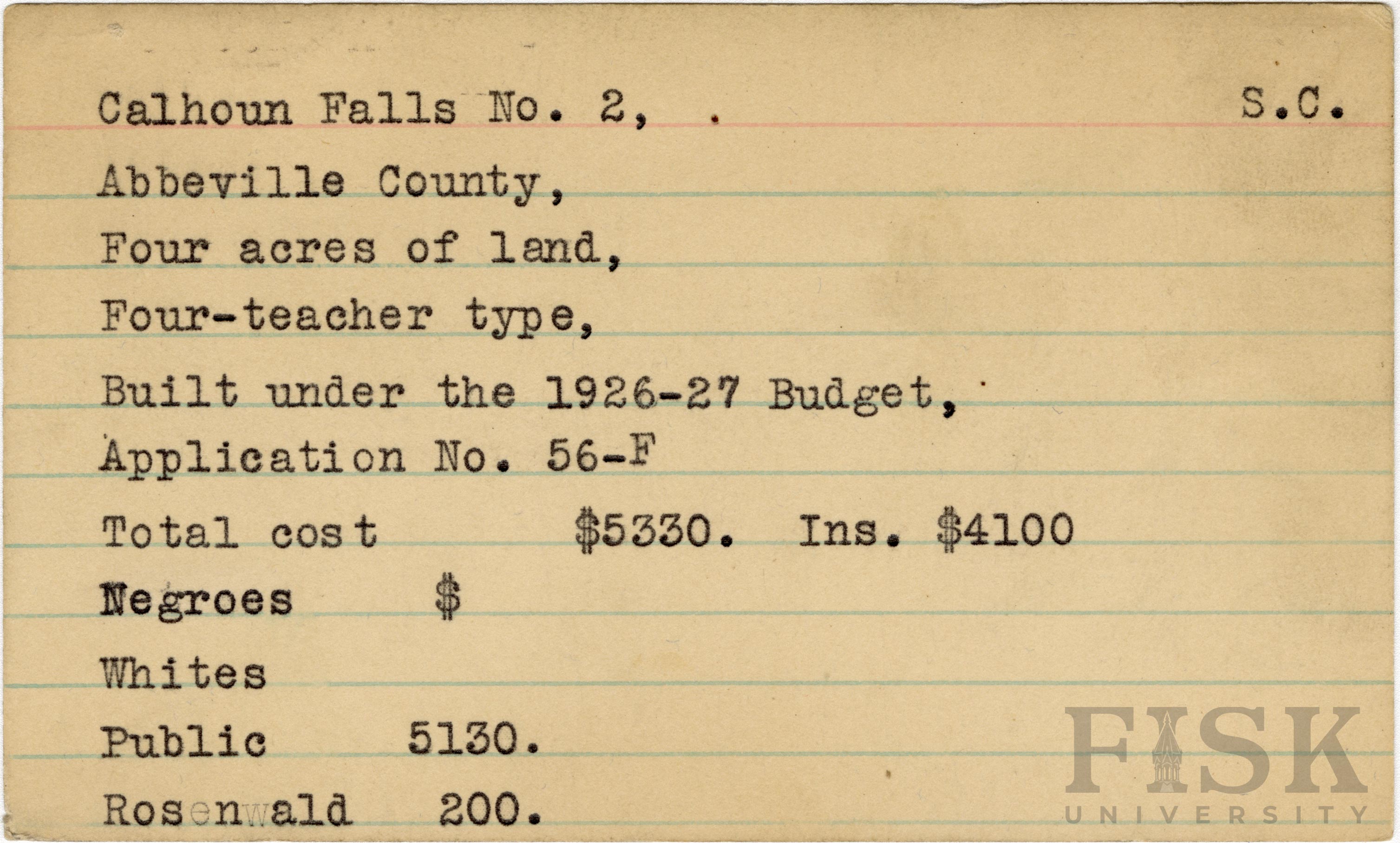 - School card from Rosenwald Fund for Calhoun Falls No. 2 in Abbeville County, South Carolina with a section added to the budget contributions that says, "Ins. $4,100"