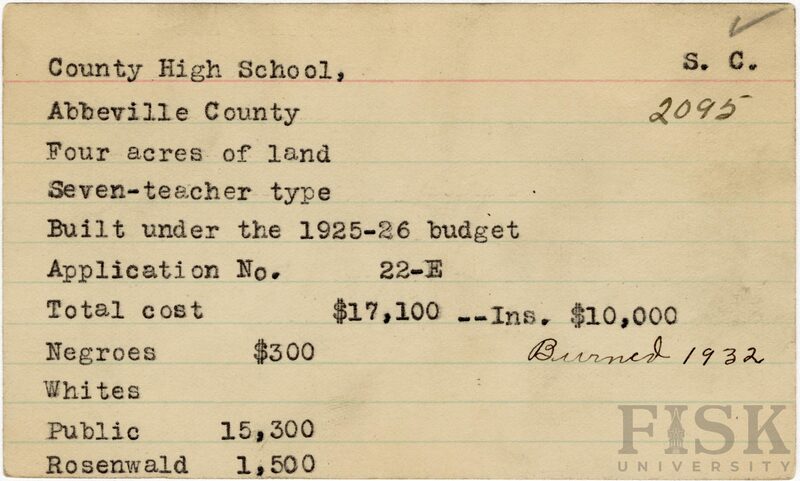 - School card from Rosenwald Fund for County High School in Abbeville County, South Carolina with a section added to the budget contributions that says, "Ins. $10,000" and a handwritten note on the card that says, "Burned 1932"