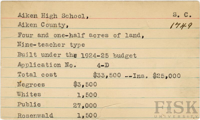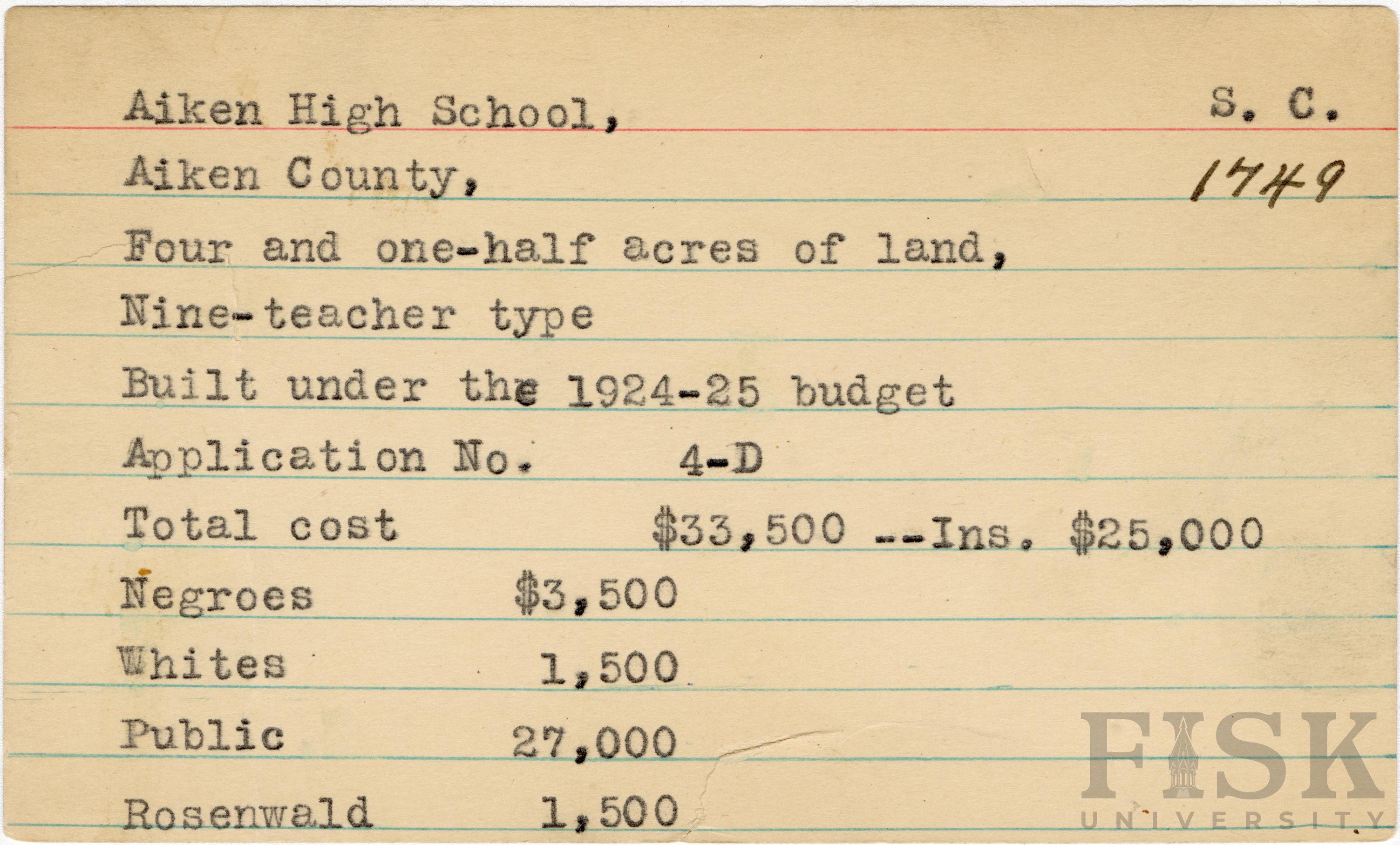 - School card from Rosenwald Fund for Aiken High School in Aiken County, South Carolina with a section added to the budget contributions that says, "Ins. $25,000"