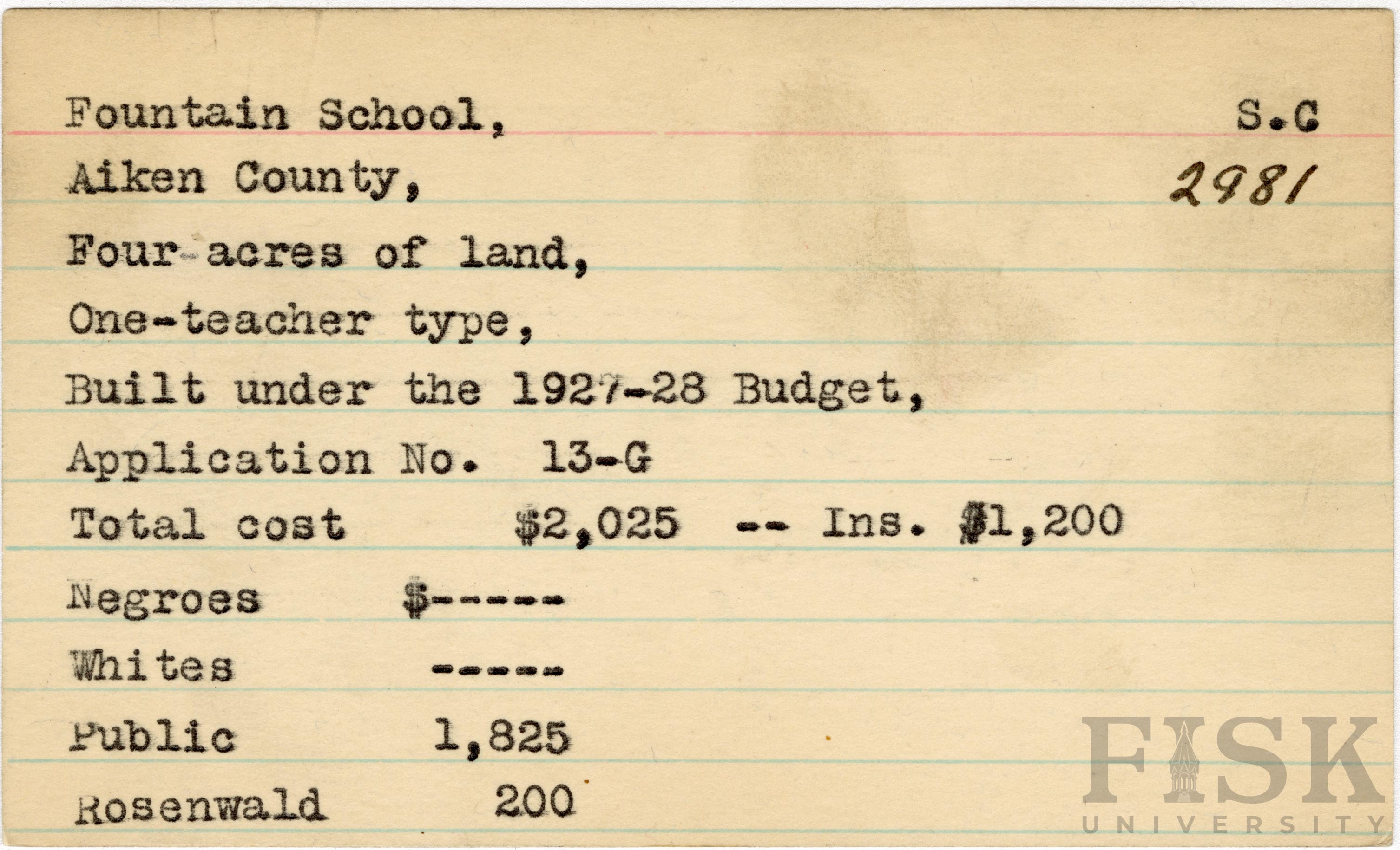 - School card from Rosenwald Fund for Fountain School in Aiken County, South Carolina with a section added to the budget contributions that says, "Ins. $1,200"