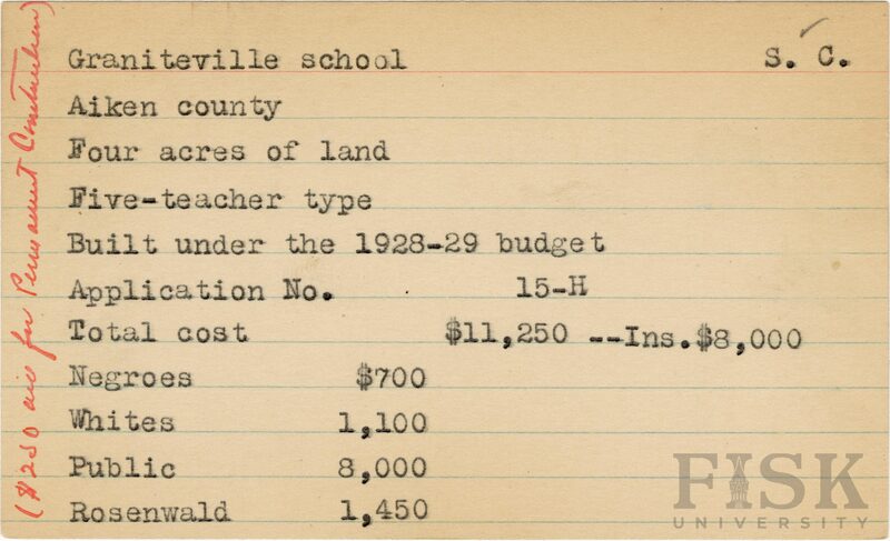 - School card from Rosenwald Fund for Graniteville School in Aiken County, South Carolina with a section added to the budget contributions that says, "Ins. $8,000" and a handwritten note on the far left of the card says, "($250 aid for permanent construction)"