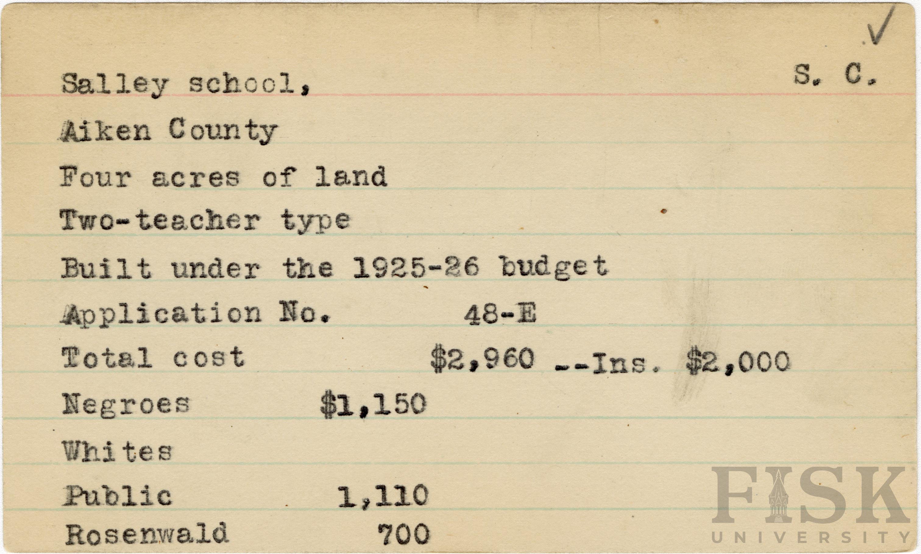 School card from Rosenwald Fund for Salley School in Aiken County, South Carolina with a section added to the budget contributions that says, "Ins. $2,000"