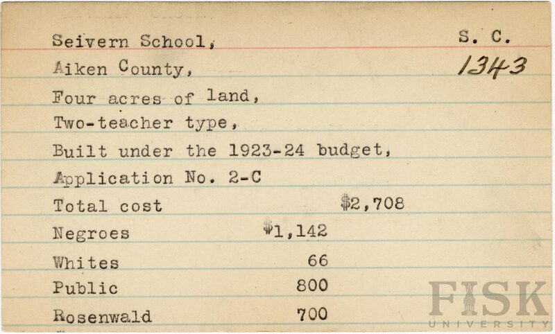 - School card from Rosenwald Fund for Seivern School in Aiken County, South Carolina