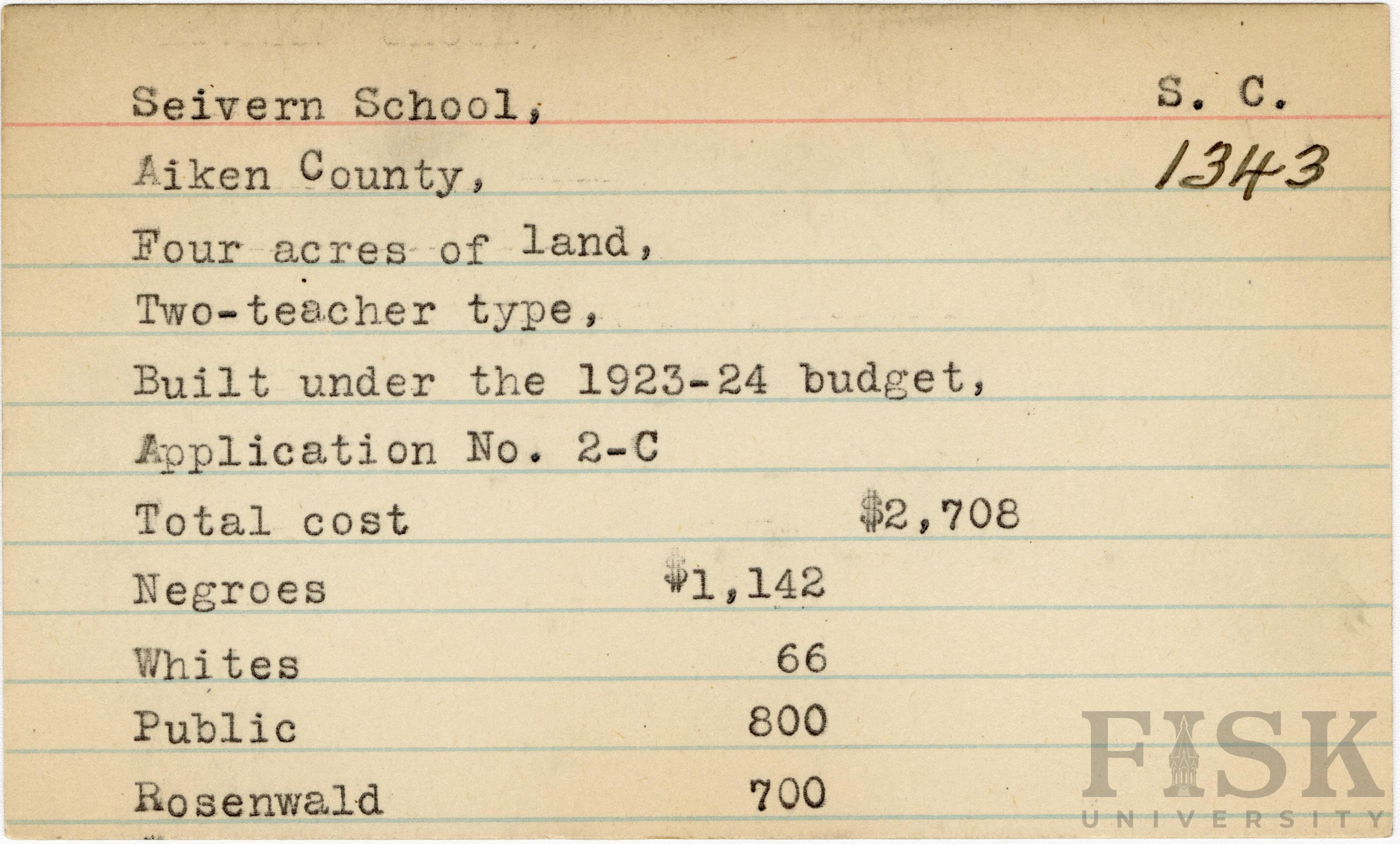School card from Rosenwald Fund for Seivern School in Aiken County, South Carolina