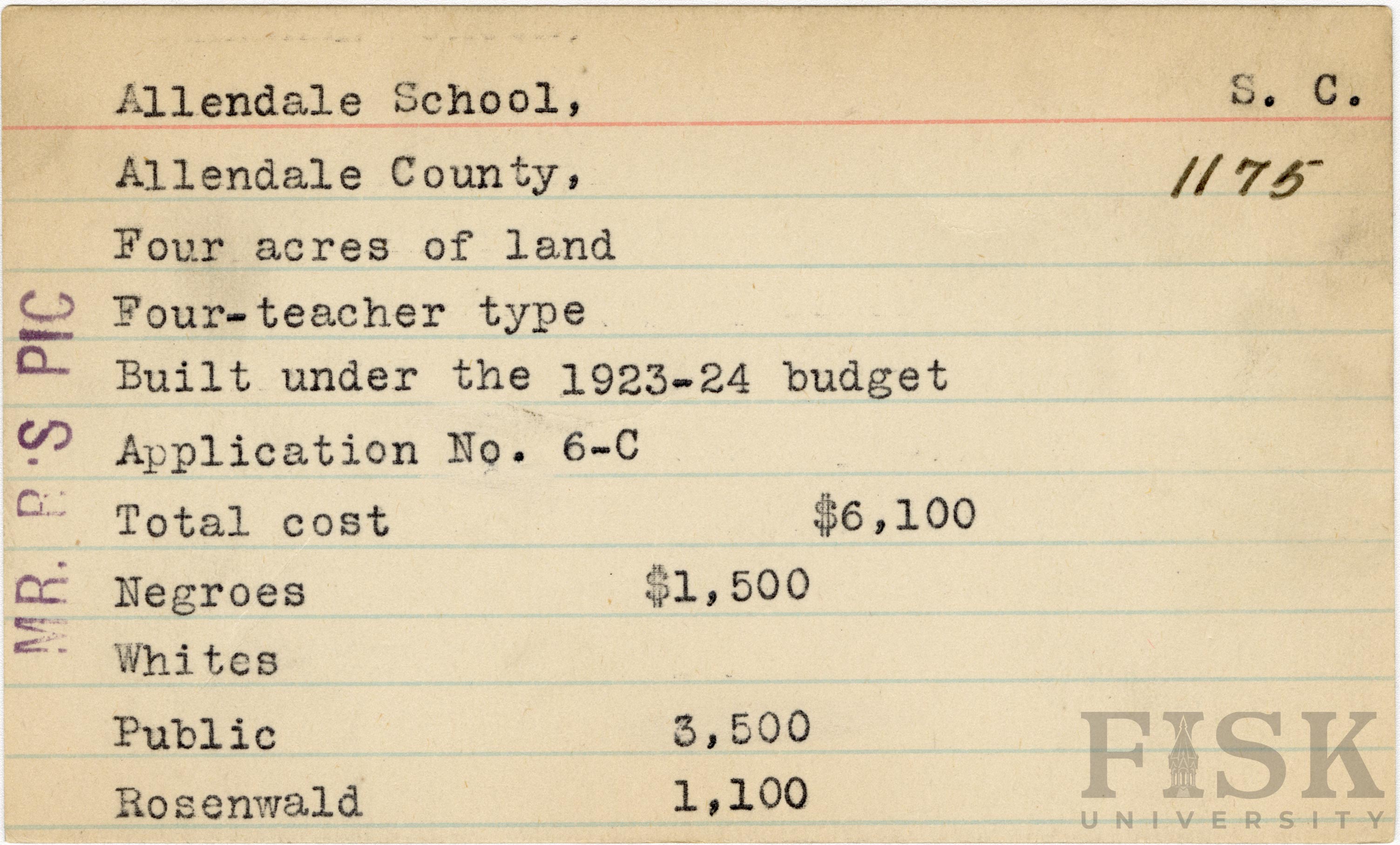 School card from Rosenwald Fund for Allendale School in Allendale County, South Carolina with a note on the far left of the card that says, "Mr. R's Pic"