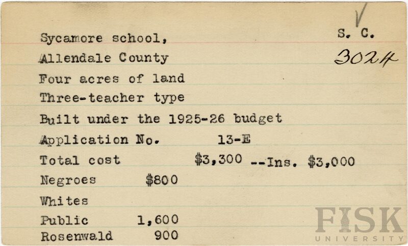 - School card from Rosenwald Fund for Sycamore School in Allendale County, South Carolina with a section added to the budget contributions that says, "Ins. $3,000"