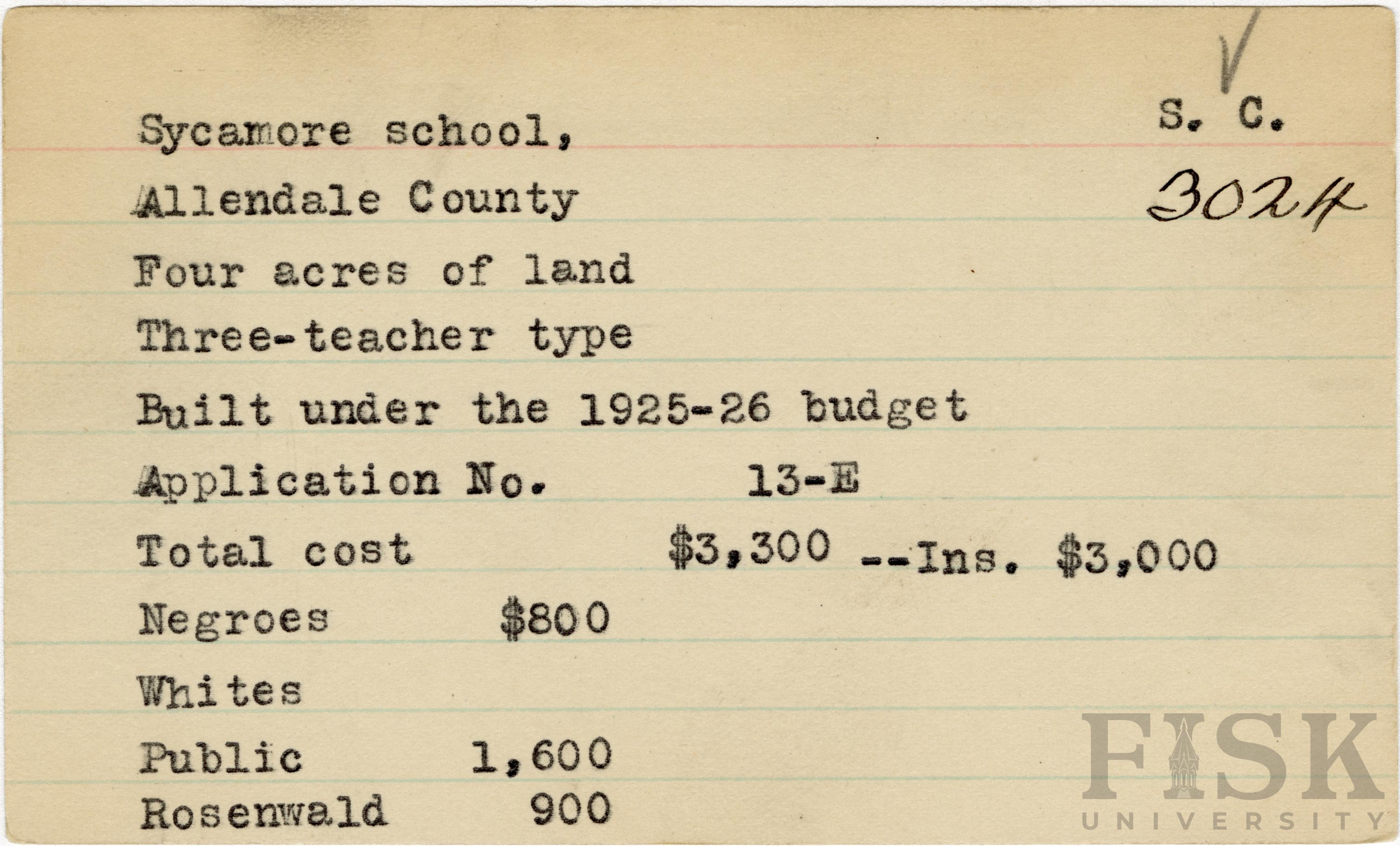 School card from Rosenwald Fund for Sycamore School in Allendale County, South Carolina with a section added to the budget contributions that says, "Ins. $3,000"