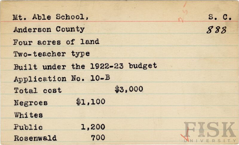 - School card from Rosenwald Fund for Mt. Able School in Anderson County, South Carolina