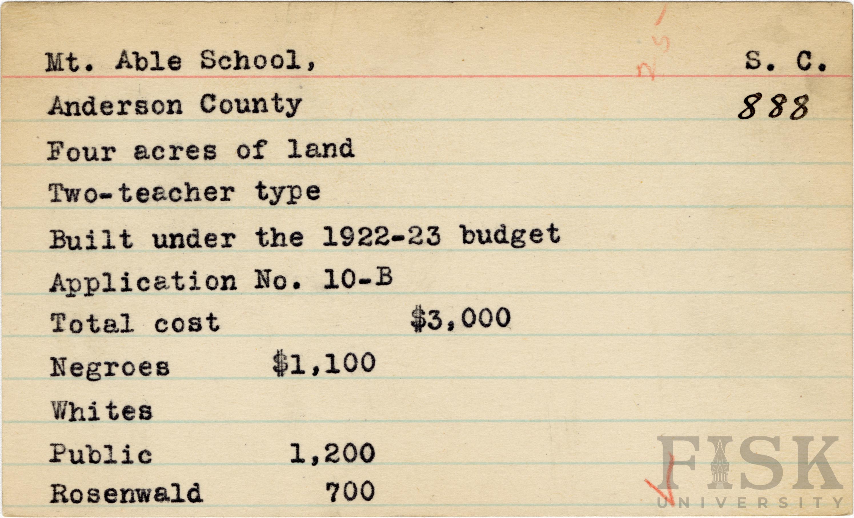 School card from Rosenwald Fund for Mt. Able School in Anderson County, South Carolina