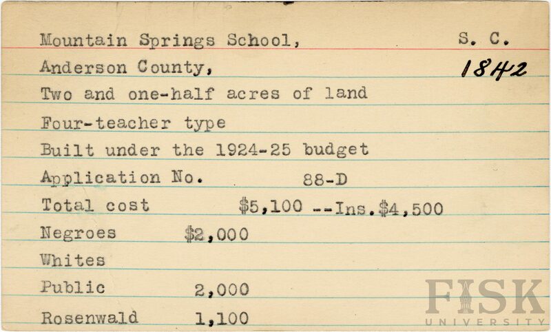 - School card from Rosenwald Fund for Mountain Springs School in Anderson County, South Carolina with a section added to the budget contributions that says, "Ins. $4,500"