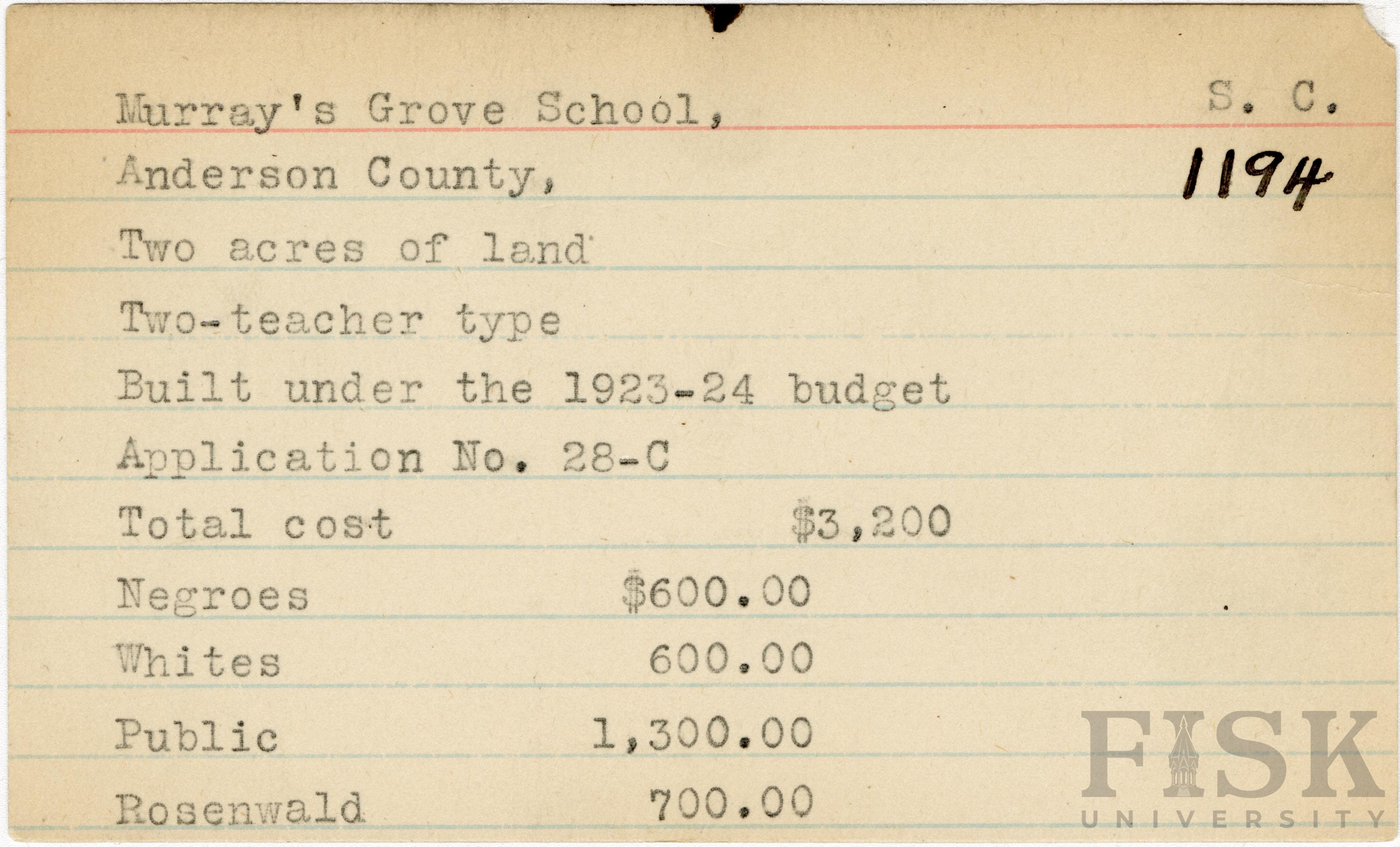 - School card from Rosenwald Fund for Murray's Grove School in Anderson County, South Carolina
