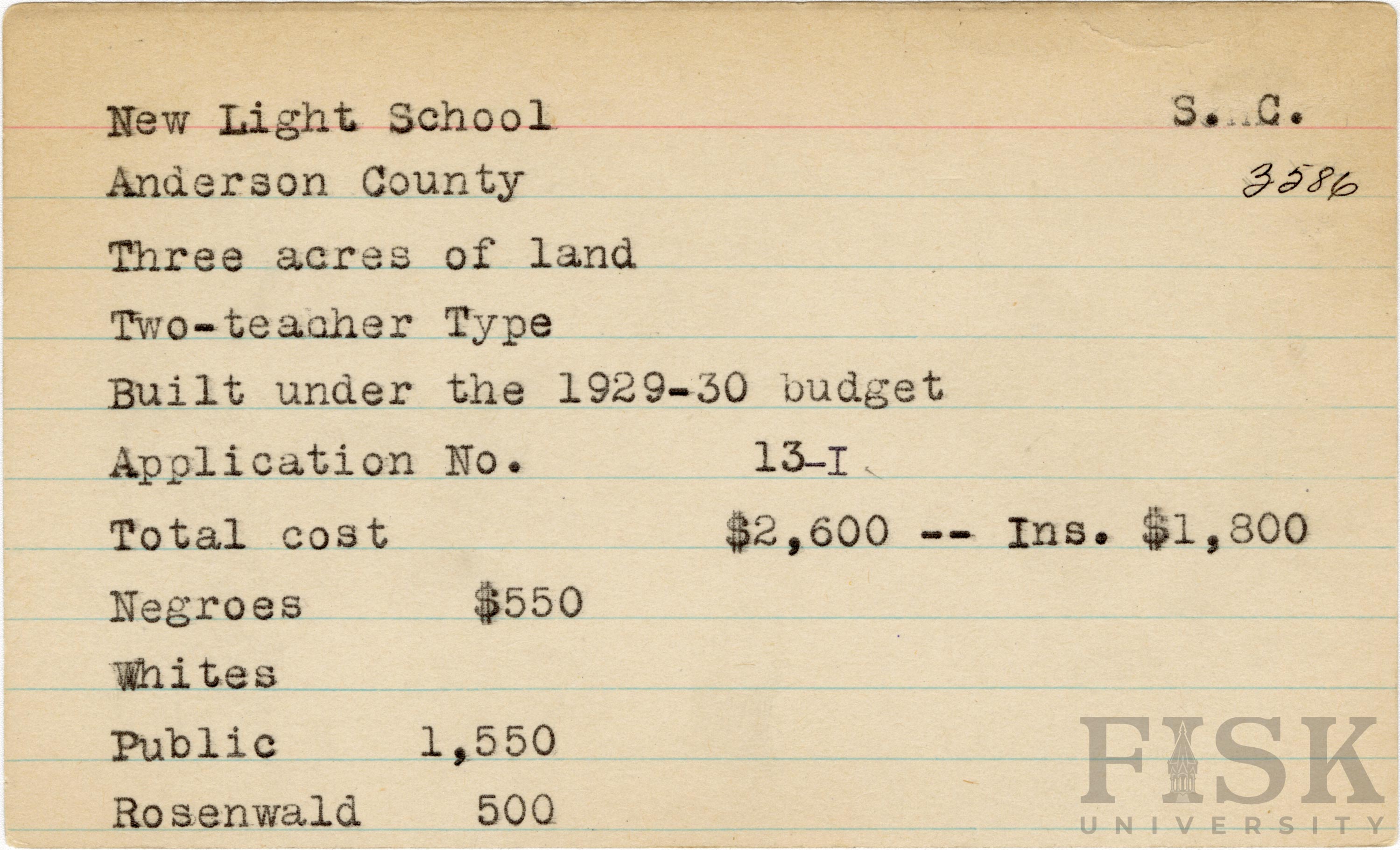 - School card from Rosenwald Fund for New Light School in Anderson County, South Carolina with a section added to the budget contributions that says, "Ins. $1,800"