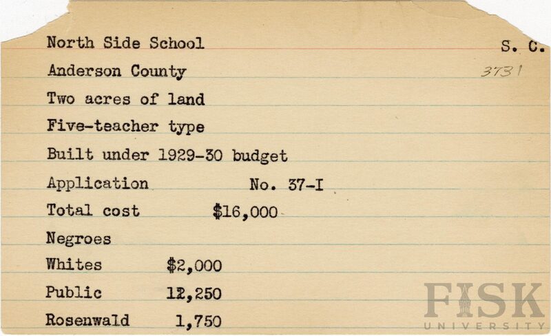 - School card from Rosenwald Fund for North Side School in Anderson County, South Carolina