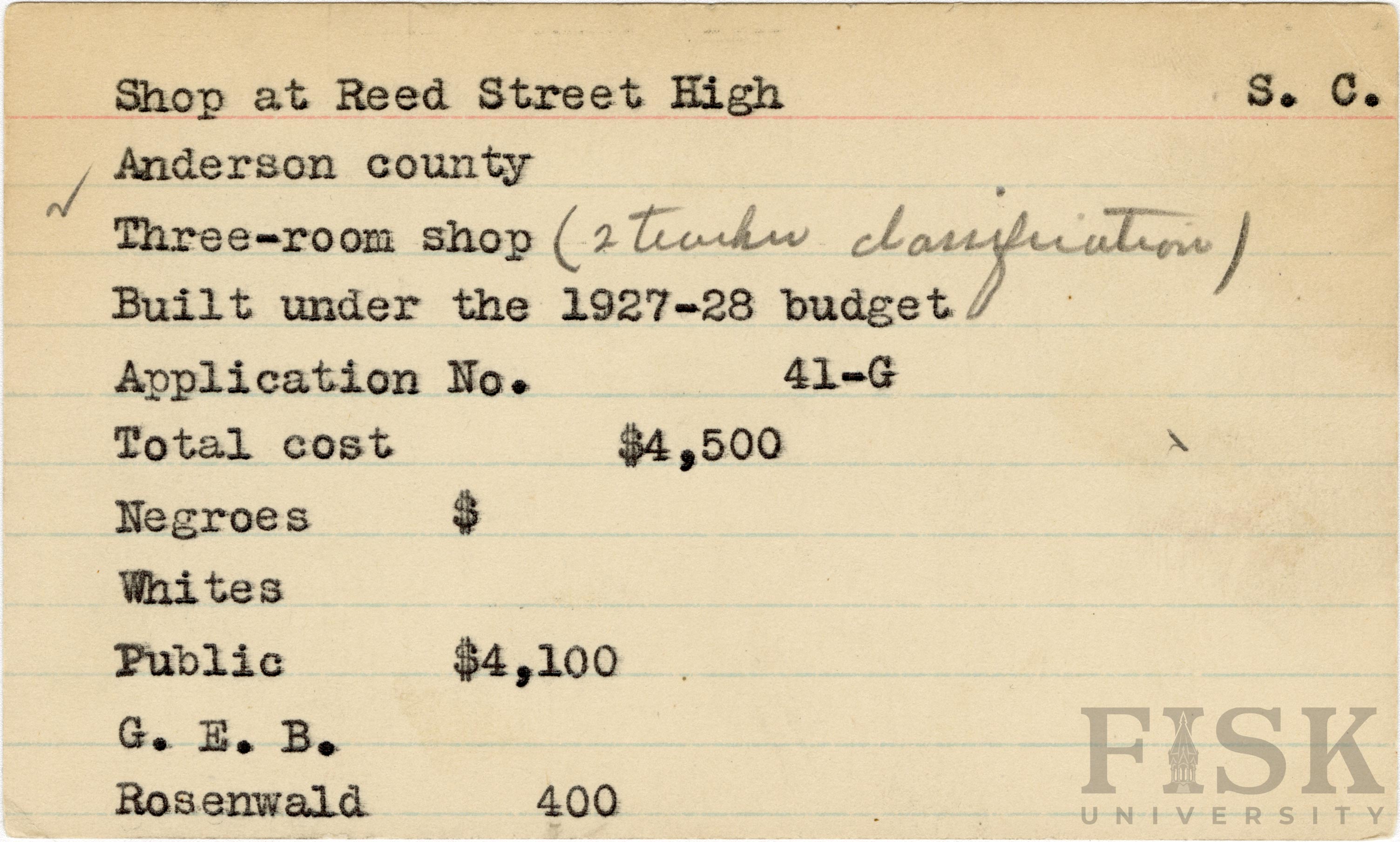 - School card from Rosenwald Fund for the three room shop at Reed Street School in Anderson County, South Carolina with a "G.E.B." section added to the budget contributions that has no monetary donation assigned