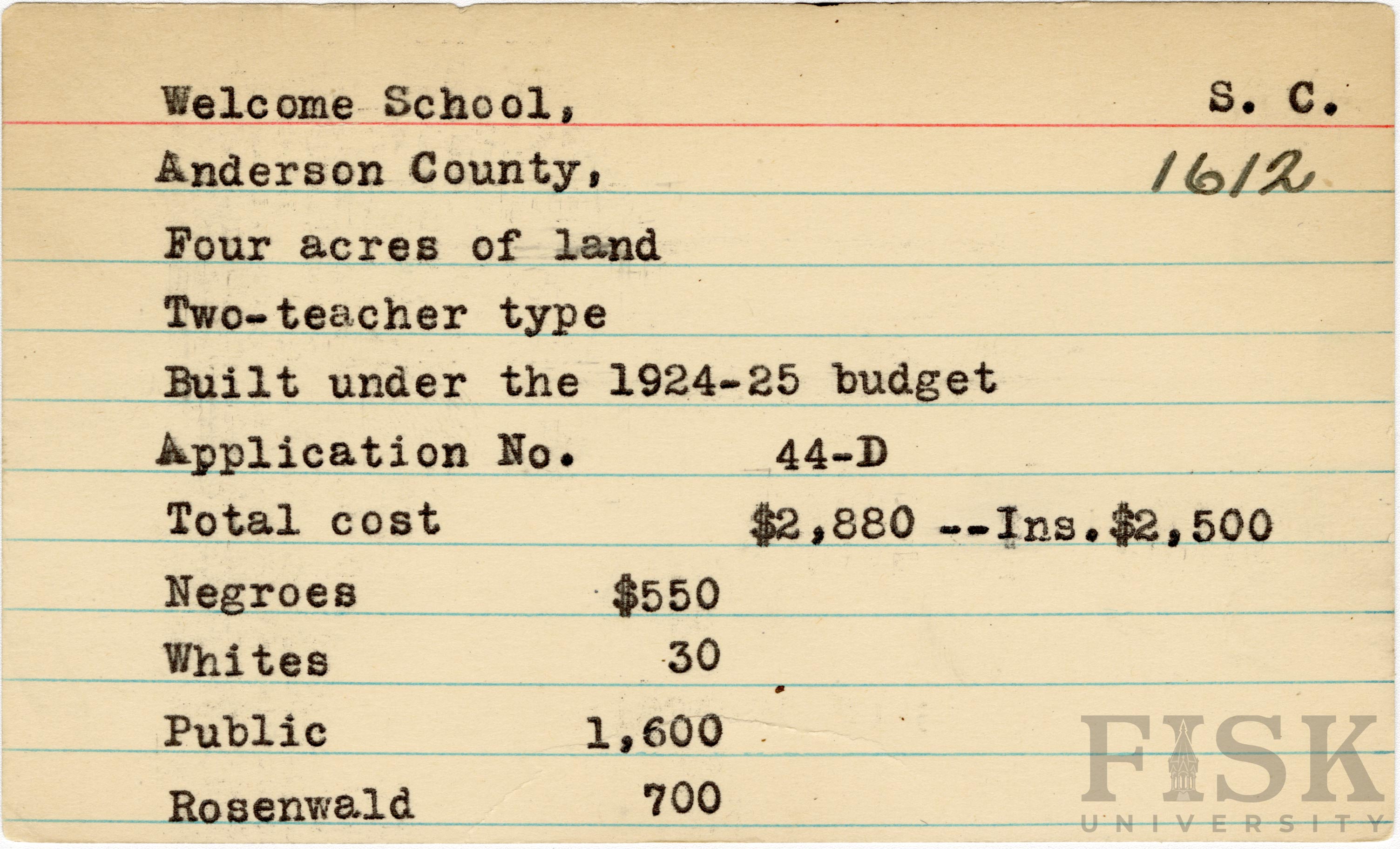 - School card from Rosenwald Fund for Welcome School in Anderson County, South Carolina with a section added to the budget contributions that says, "Ins. $2,500"