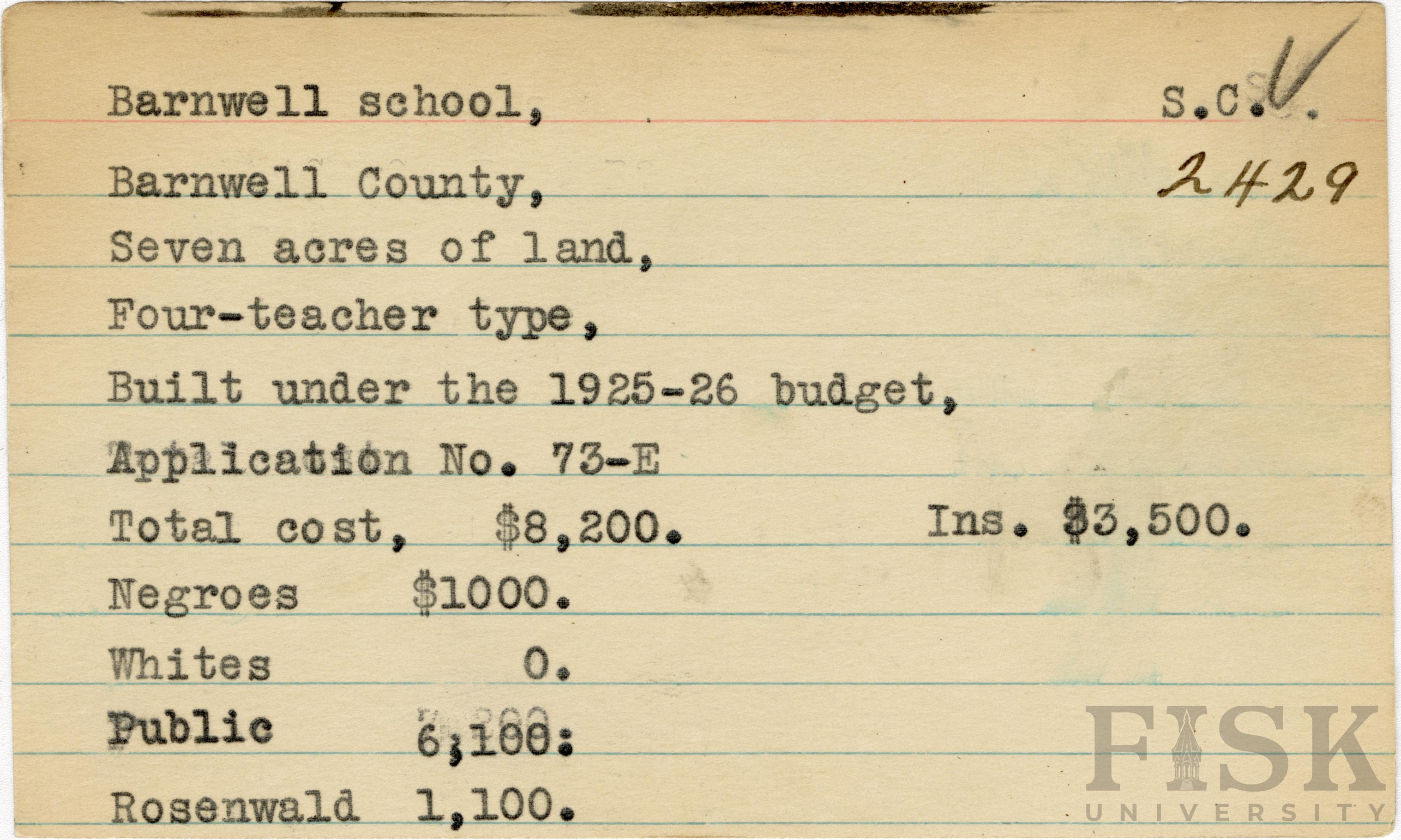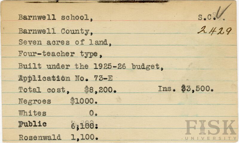 - School card from Rosenwald Fund for Barnwell School in Barnwell County, South Carolina with a section added to the budget contributions that says, "Ins. $3,500"
