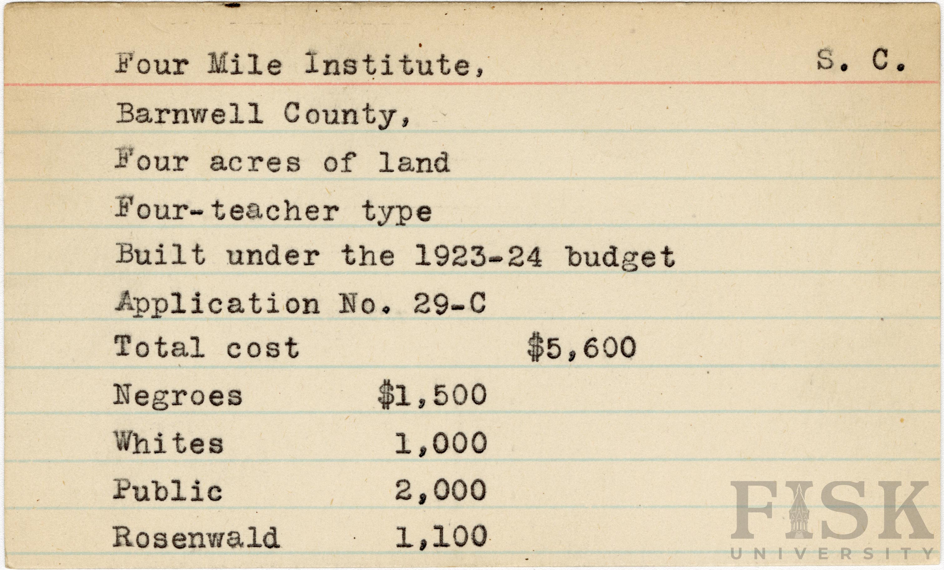 - School card from Rosenwald Fund for Four Mile Institute in Barnwell County, South Carolina