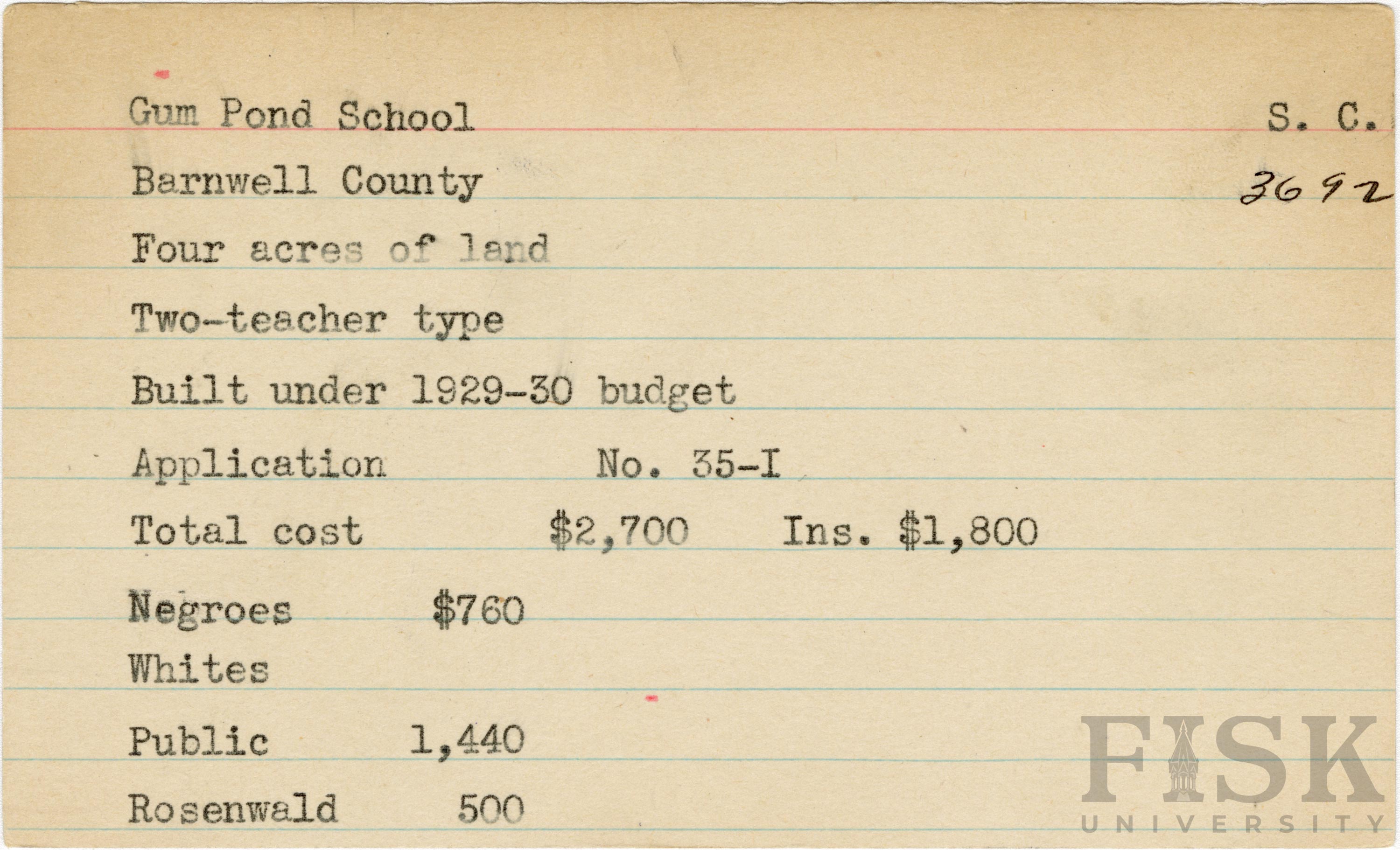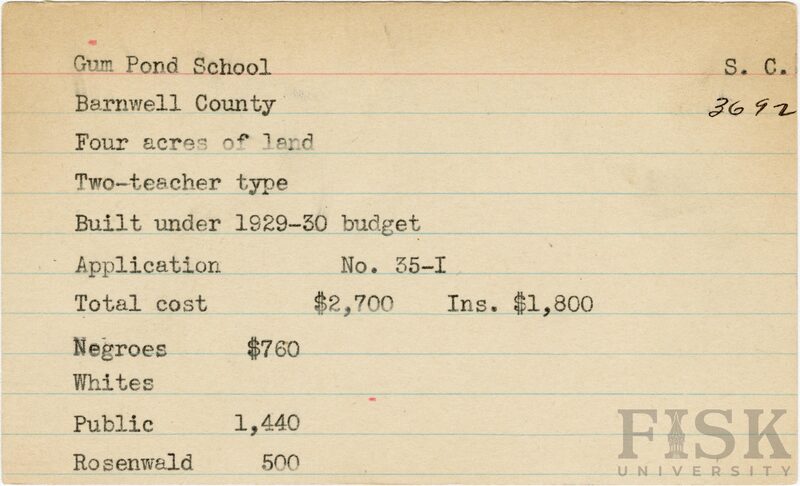 - School card from Rosenwald Fund for Gum Pond School in Barnwell County, South Carolina with a section added to the budget contributions that says, "Ins. $1,800"