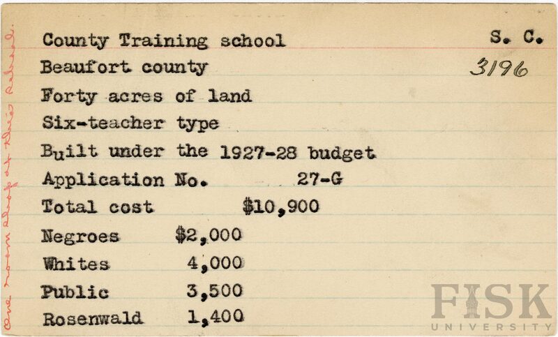 - School card from Rosenwald Fund for County Training School in Beaufort County, South Carolina with a handwritten note on the far left of the card says, "one room shop at this school"