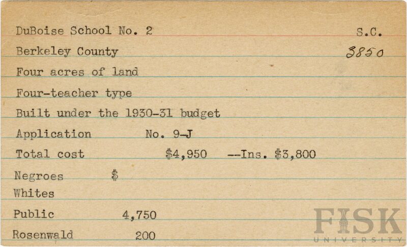 School card from Rosenwald Fund for DuBoise School No. 2 in Berkeley County, South Carolina with a section added to the budget contributions that says, "Ins. $3,800"