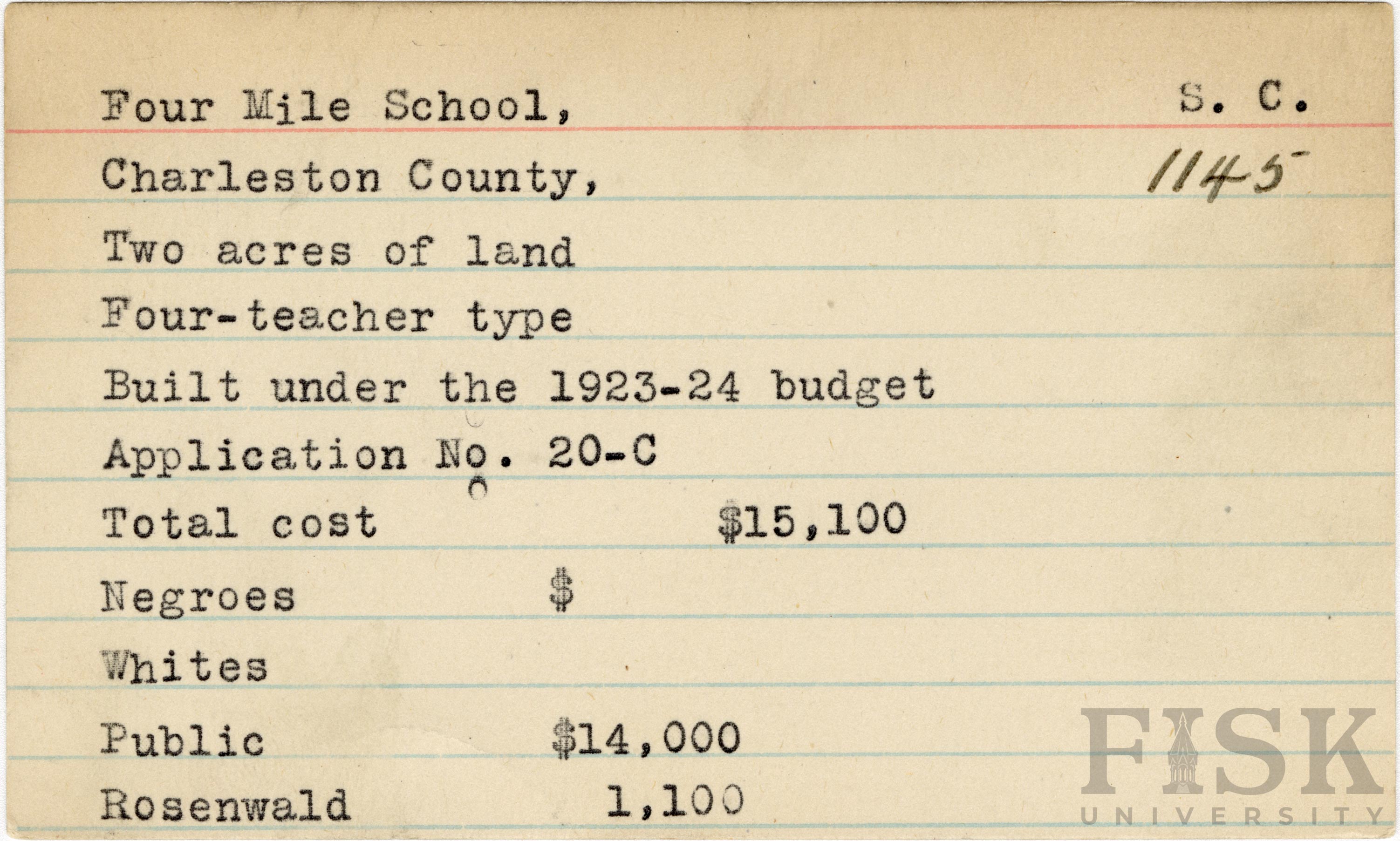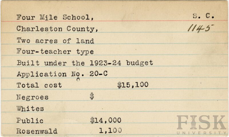 - School card from Rosenwald Fund for Four Mile School in Charleston County, South Carolina
