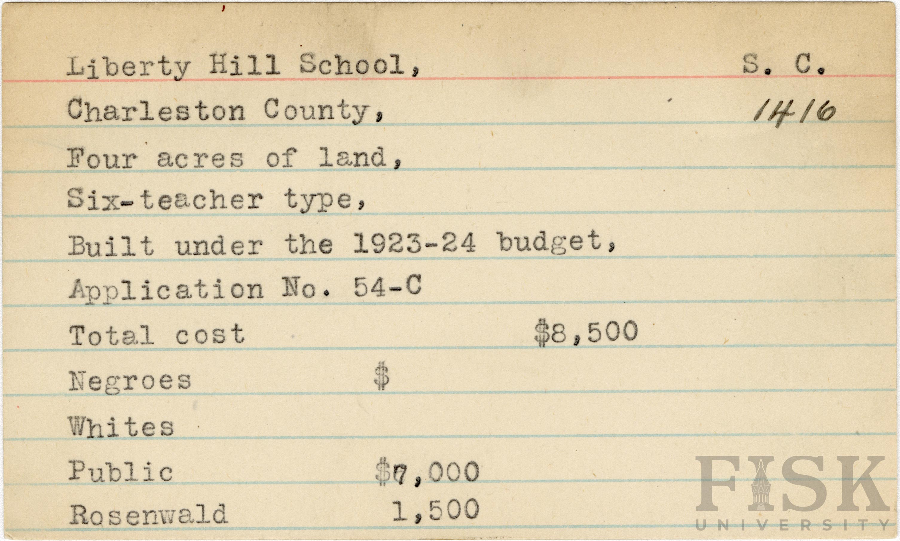 - School card from Rosenwald Fund for Liberty Hill School in Charleston County, South Carolina