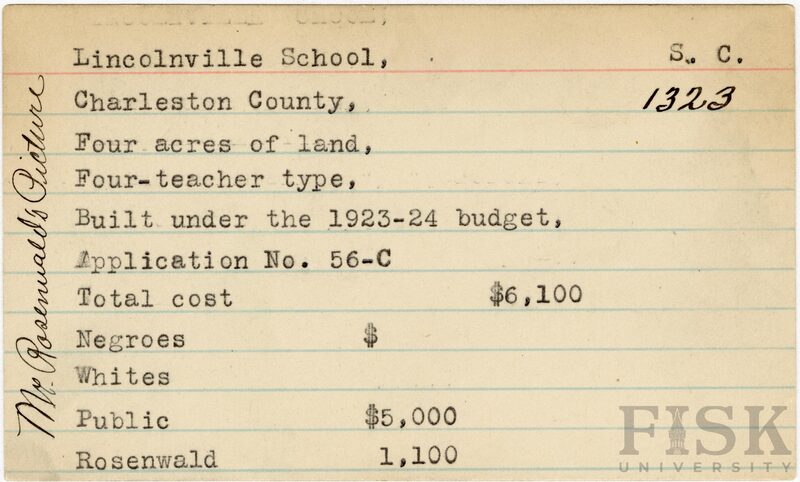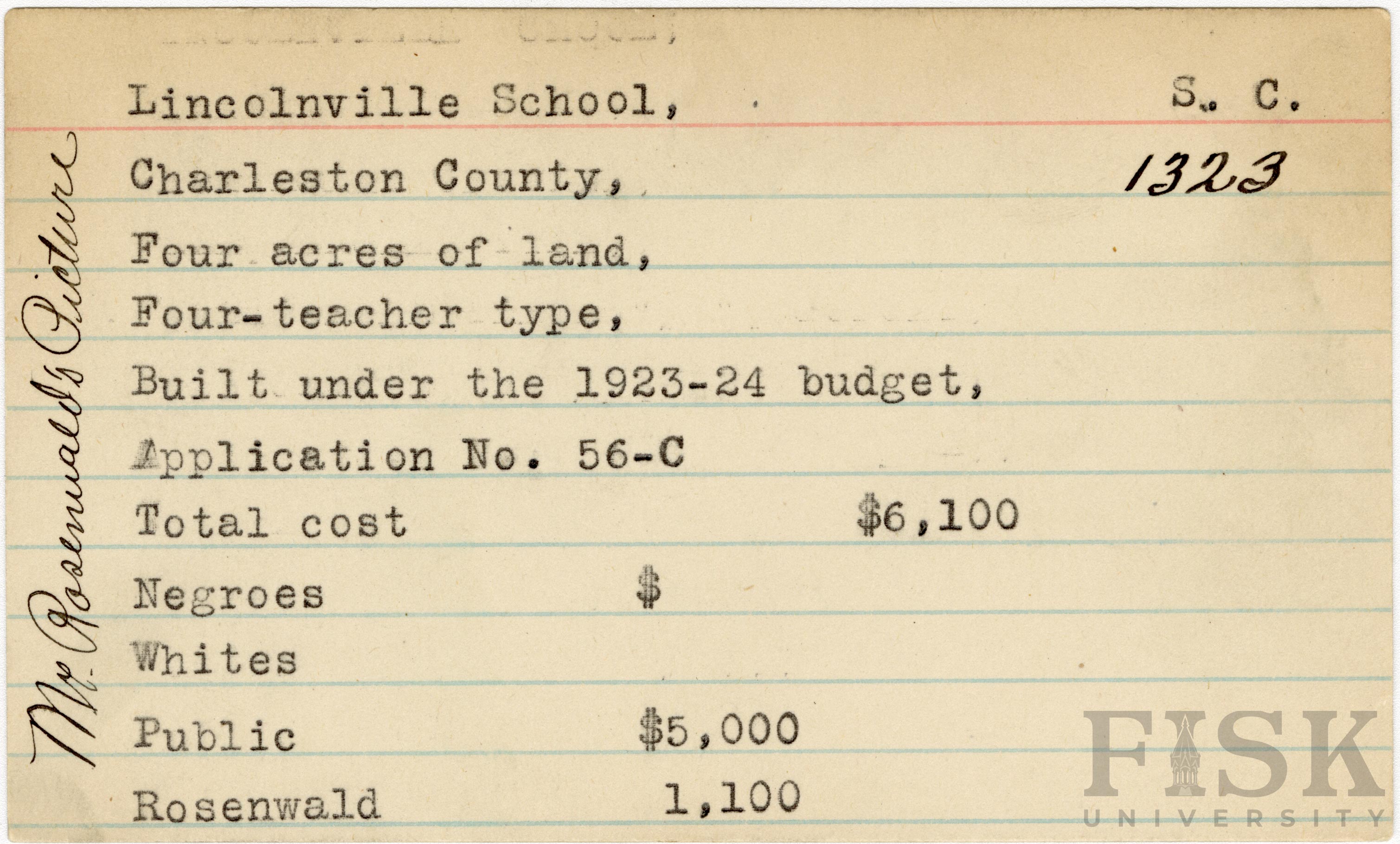 - School card from Rosenwald Fund for Lincolnville School in Charleston County, South Carolina with a handwritten note on the far left of the card that says, "Mr. Rosenwald's Picture"