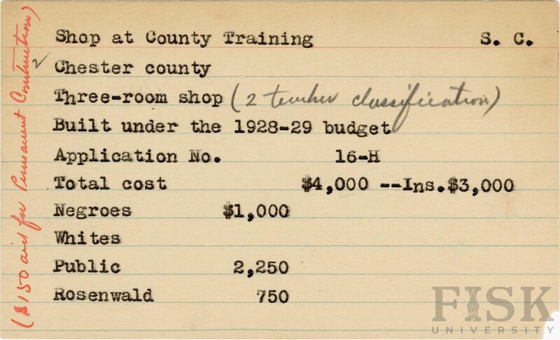 - School card from Rosenwald Fund for the three room shop at Chester School in Chester County, South Carolina with a section added to the budget contributions that says, "Ins. $3,000" and a handwritten note on the far left of the card that says, "($150 aid for permanent construction)"