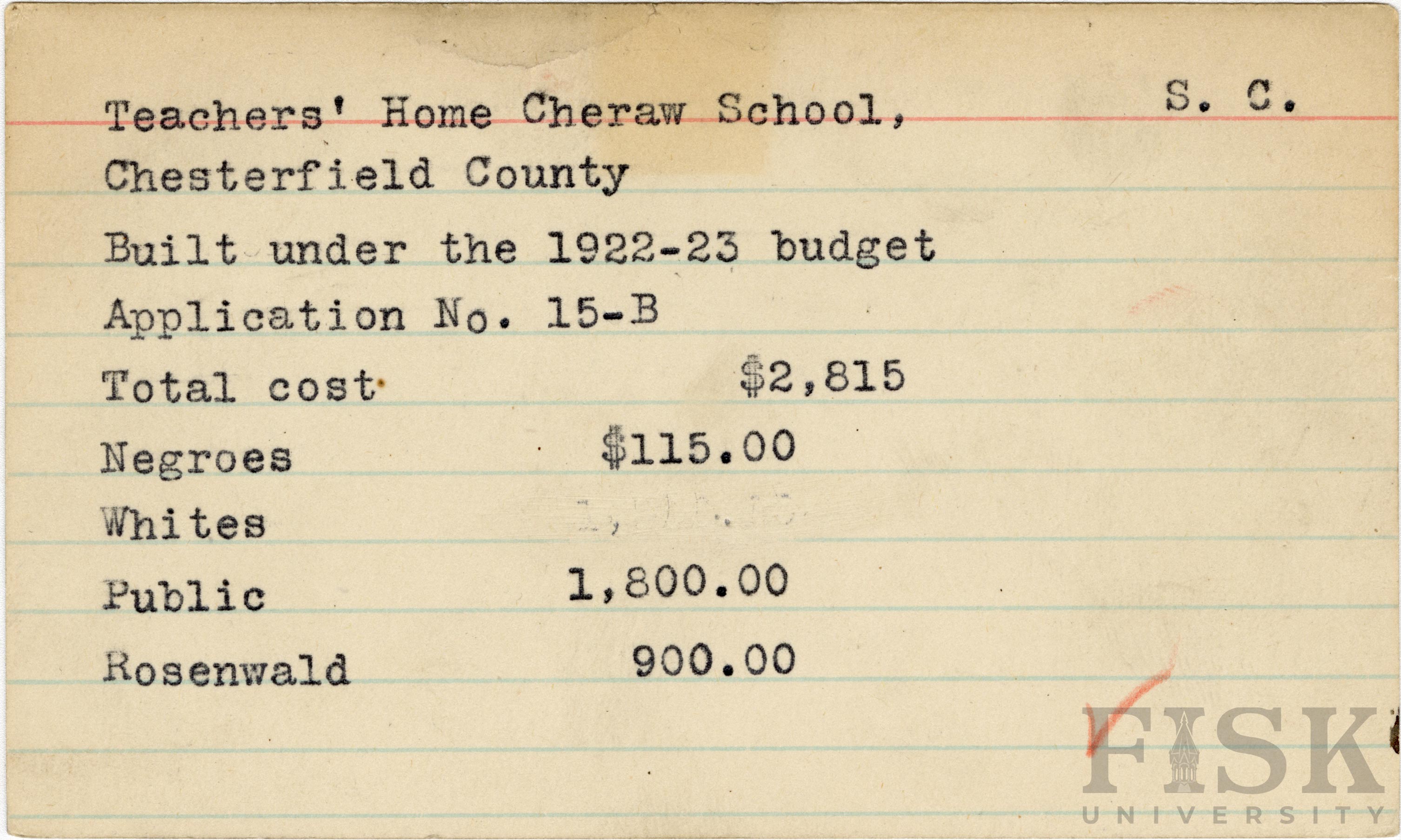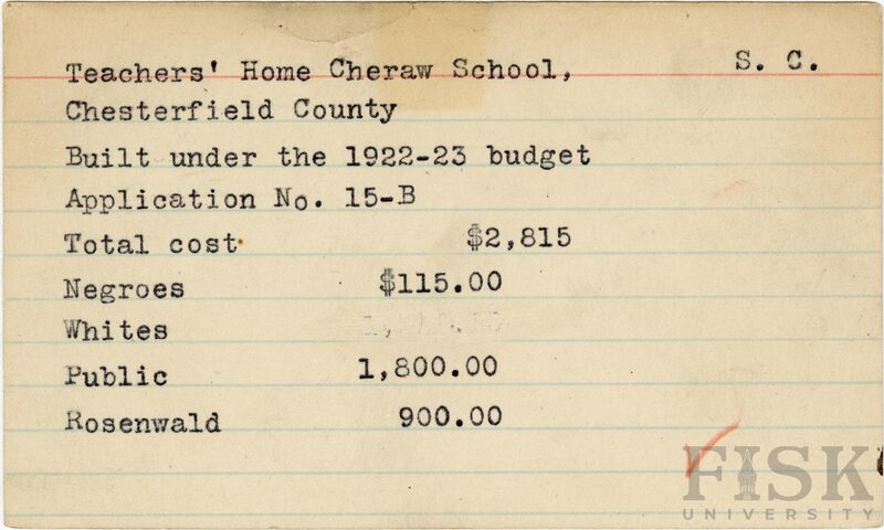 School card from Rosenwald Fund for the teacher's home at Cheraw School in Chesterfield County, South Carolina