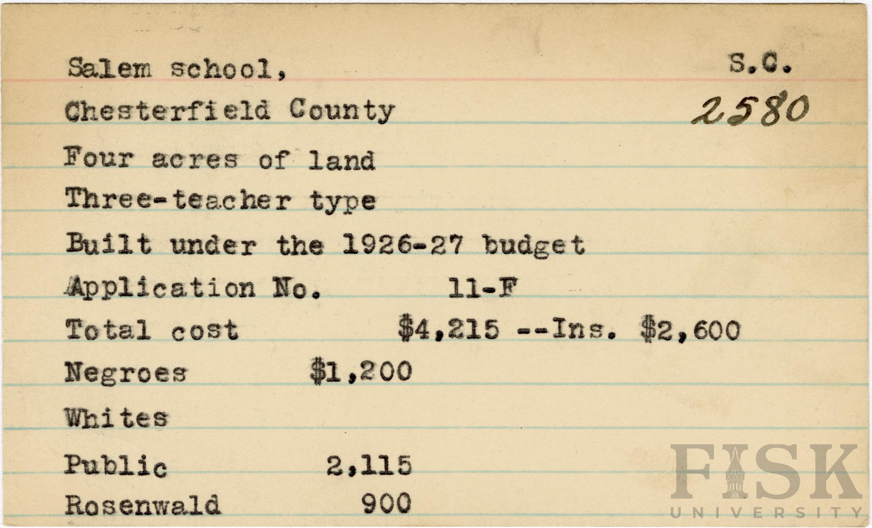 - School card from Rosenwald Fund for Salem School in Chesterfield County, South Carolina with a section added to the budget contributions that says, "Ins. $2,600"
