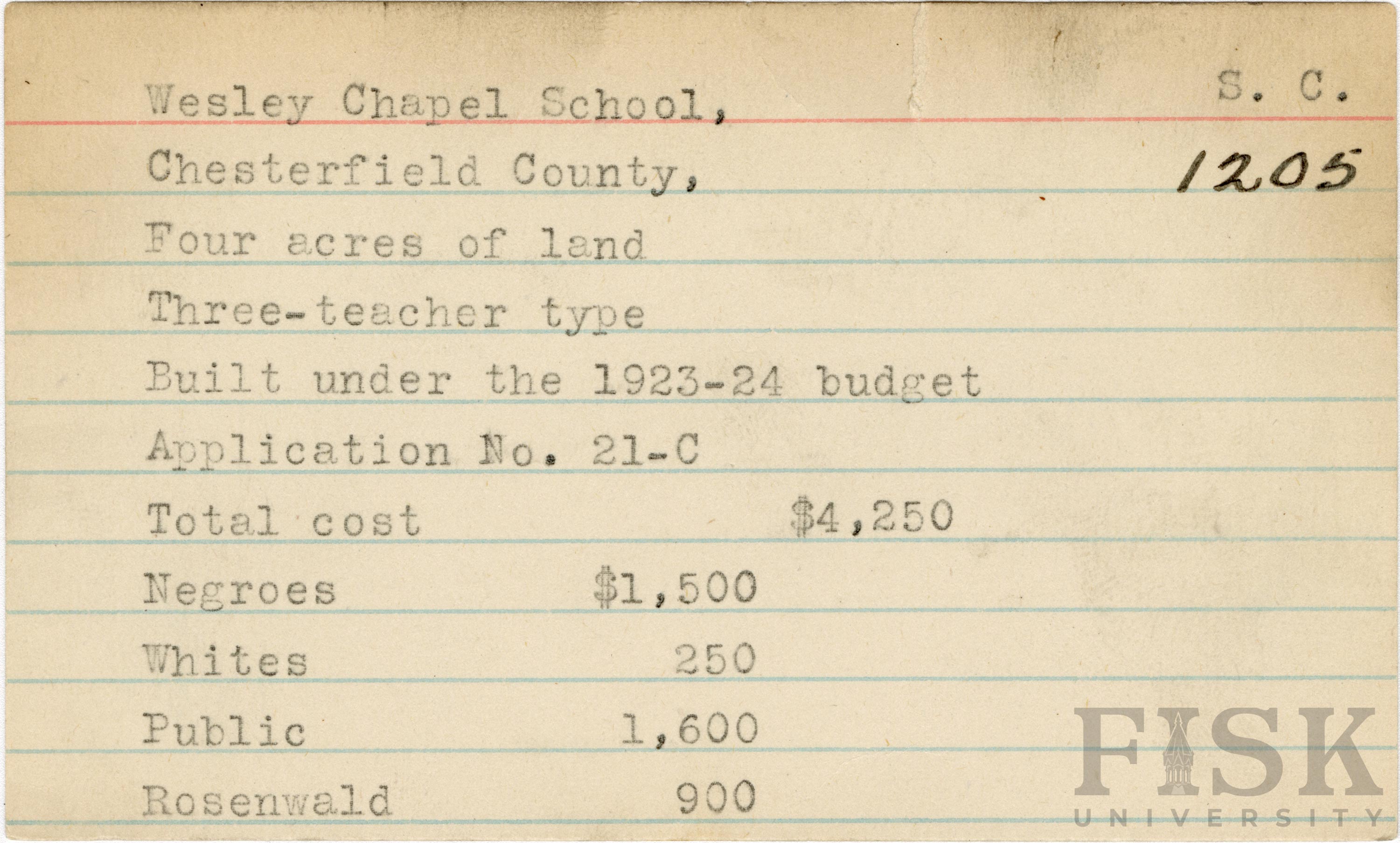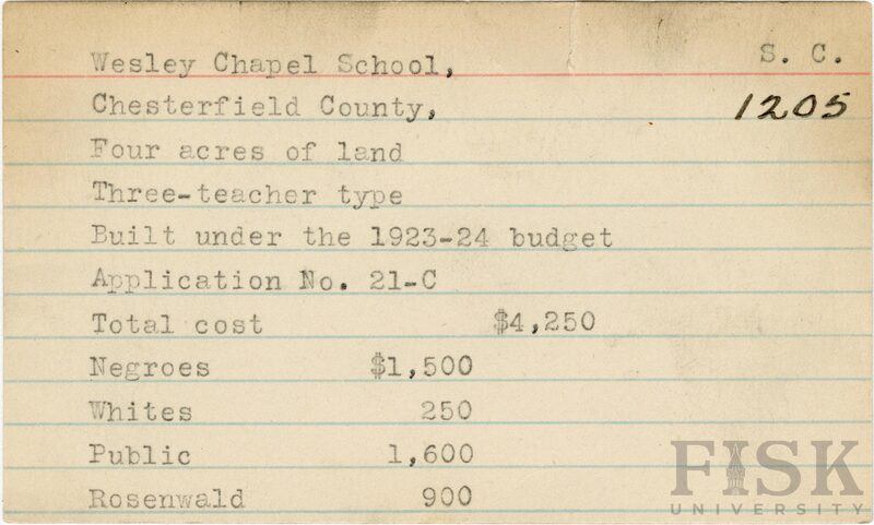 - School card from Rosenwald Fund for Wesley Chapel School in Chesterfield County, South Carolina