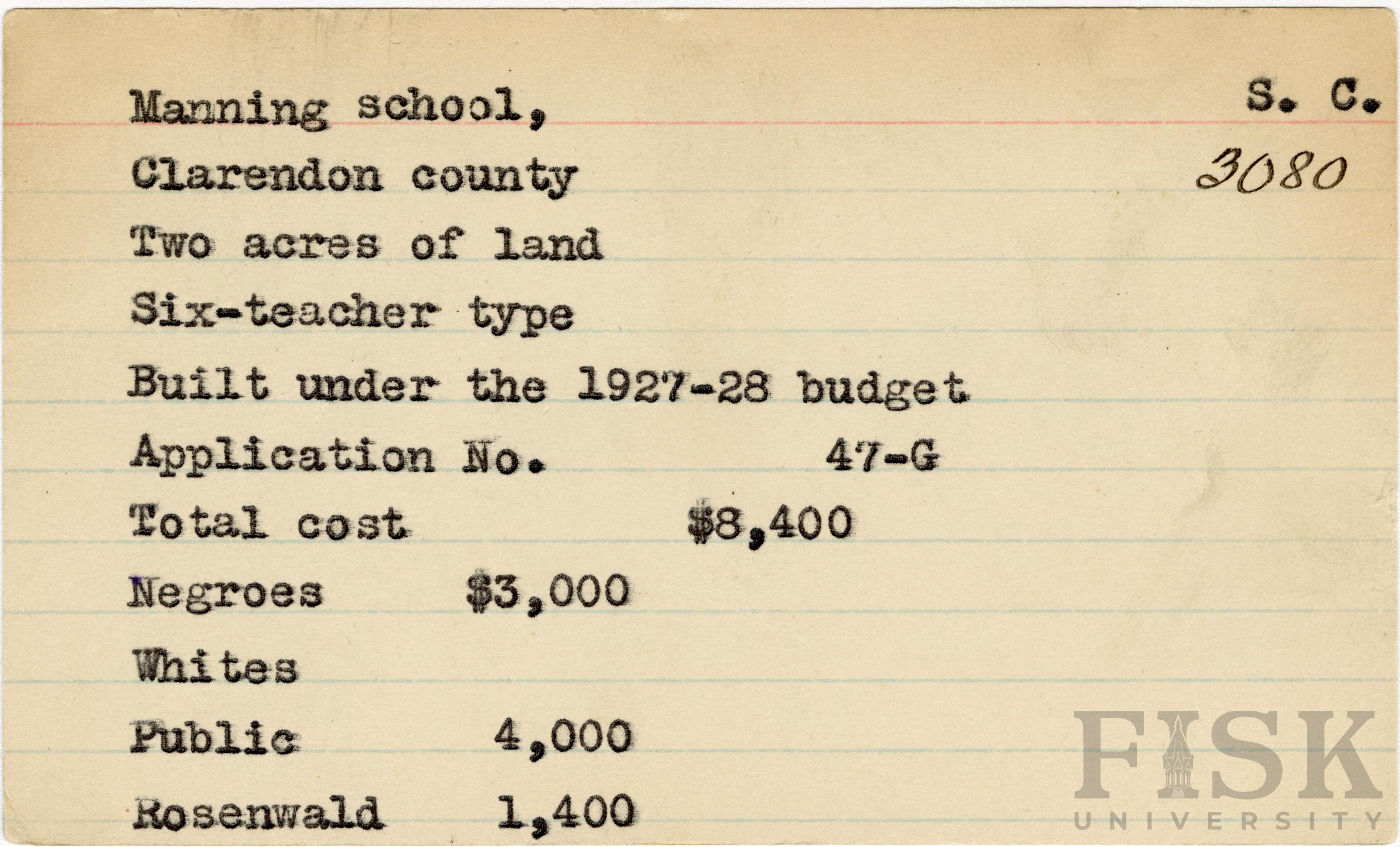 - School card from Rosenwald Fund for Manning School in Clarendon County, South Carolina