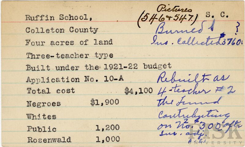 - School card from Rosenwald Fund for Ruffin School in Colleton County, South Carolina with handwritten notes on the card that say, "Pictures (546 + 547)," "Burned ? Ins. Collected 3760," and "Rebuilt as 4-teacher #2 the Fund contributing on No. 2 300 after Ins. adj. [unclear]"