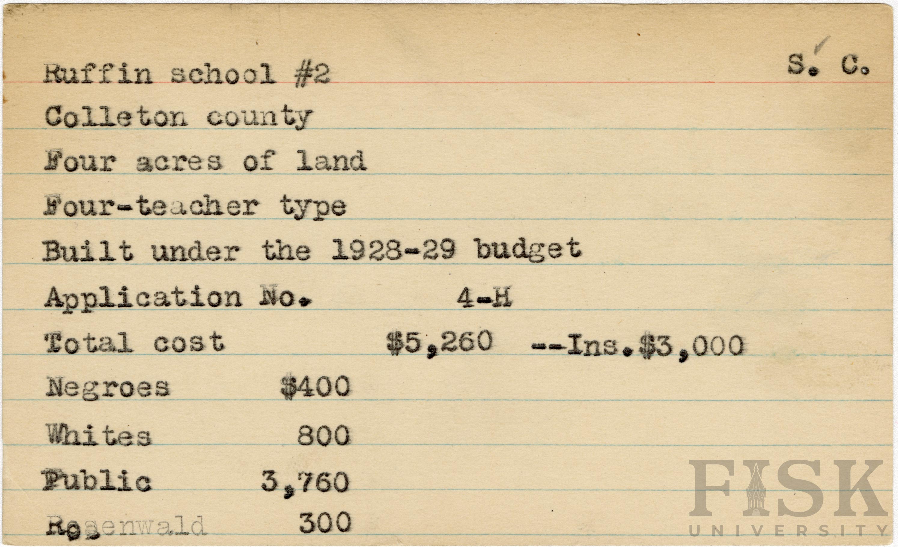 - School card from Rosenwald Fund for Ruffin School #2 in Colleton County, South Carolina with a section added to the budget contributions that says, "Ins. $3,000"