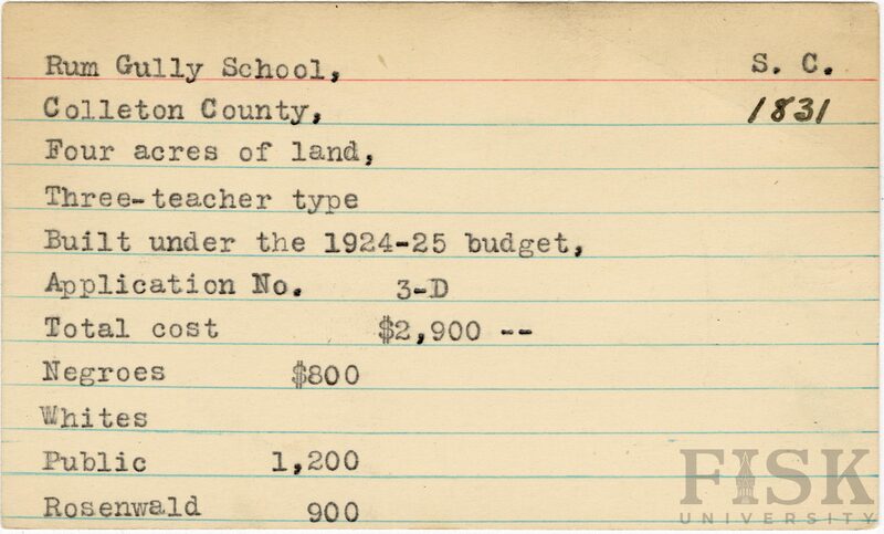 - School card from Rosenwald Fund for Rum Gully School in Colleton County, South Carolina