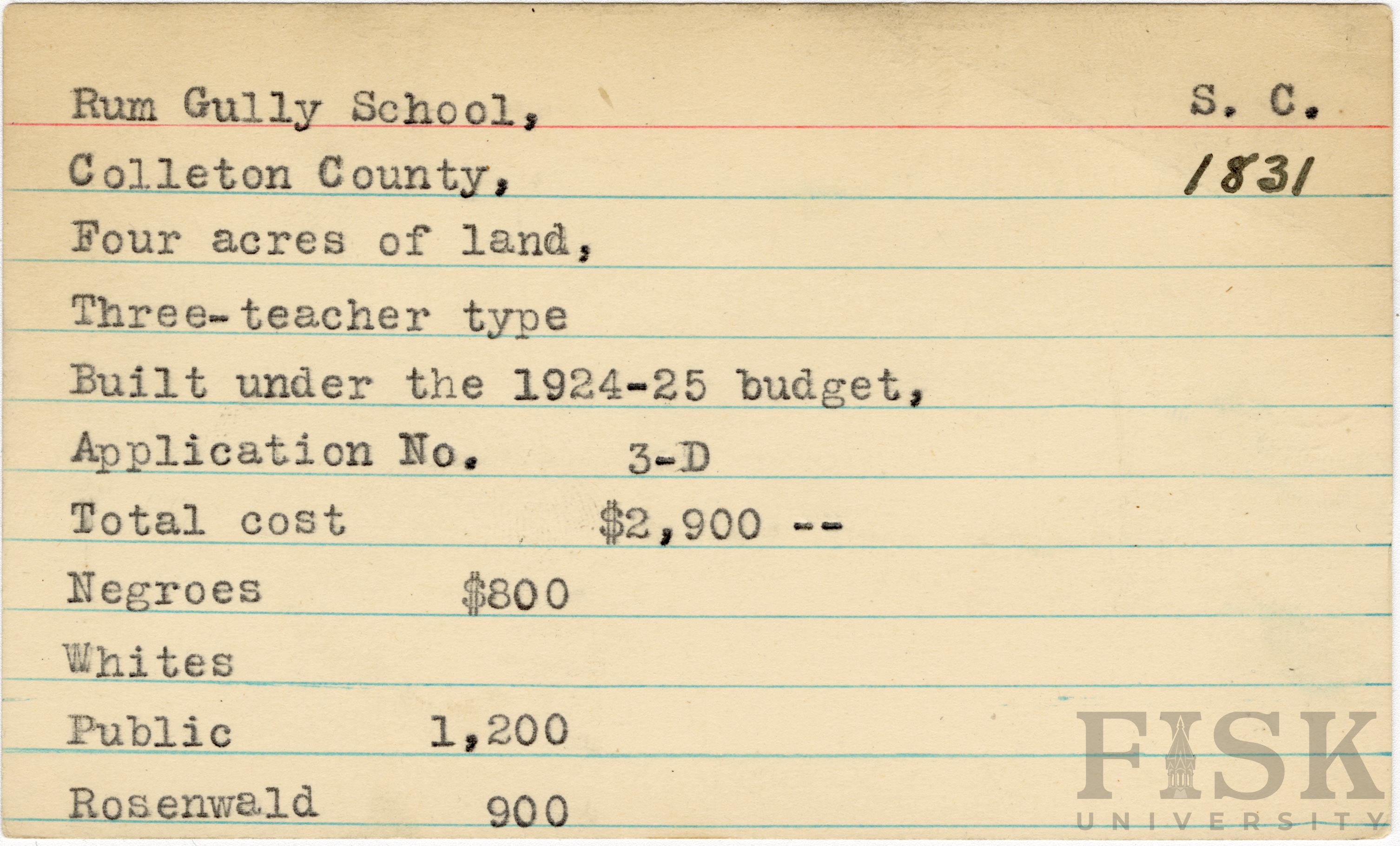 School card from Rosenwald Fund for Rum Gully School in Colleton County, South Carolina