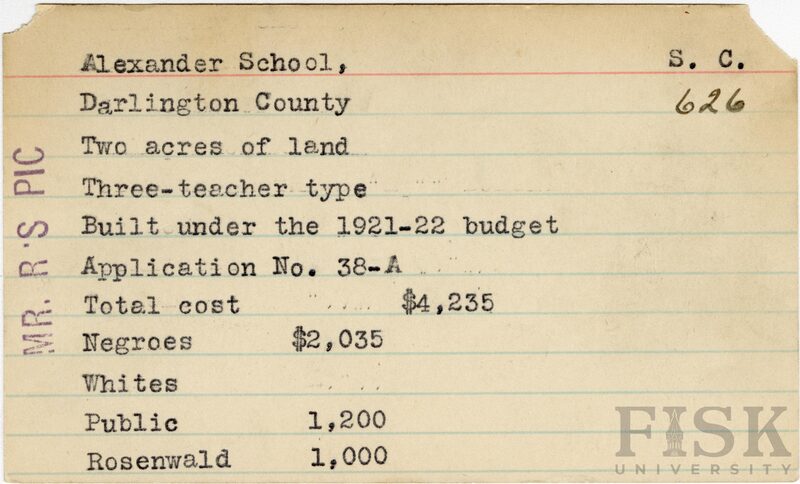 - School card from Rosenwald Fund for Alexander School in Darlington County, South Carolina with a note on the far left of the card that says, "Mr. R's Pic"