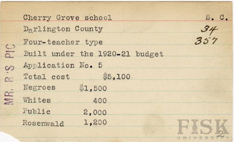 - School card from Rosenwald Fund for Cherry Grove School in Darlington County, South Carolina with a note on the card that says, "Mr. R's Pic"