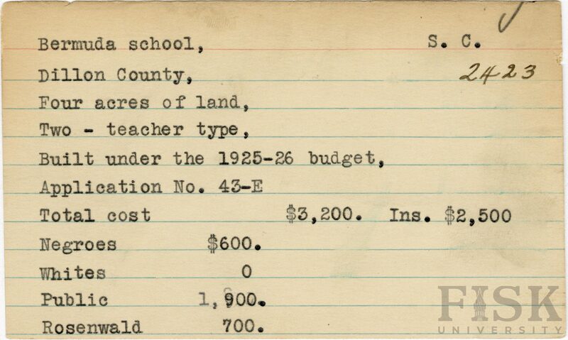 - School card from Rosenwald Fund for Bermuda School in Dillon County, South Carolina with a section added to the budget contributions that says, "Ins. $2,500"
