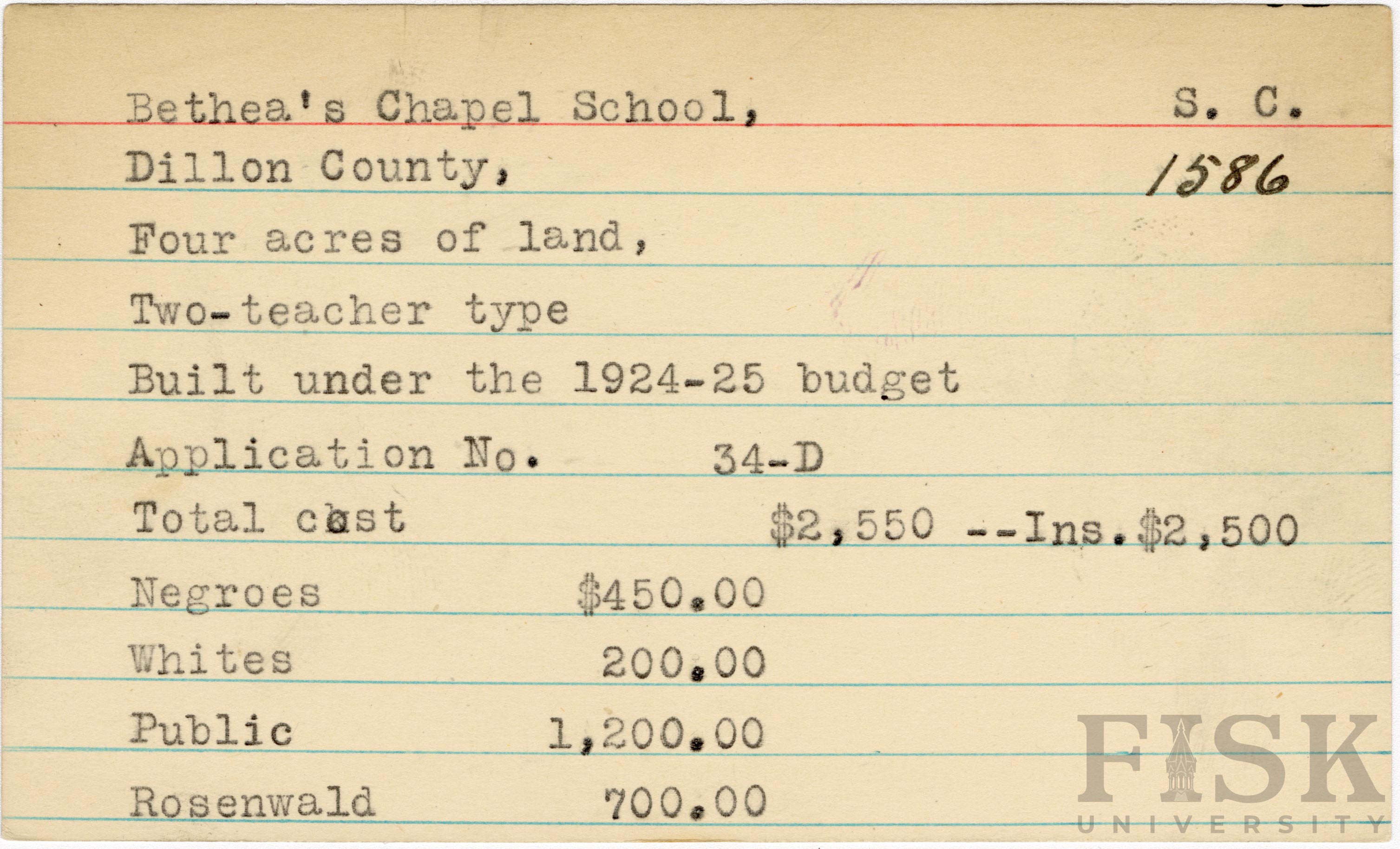 - School card from Rosenwald Fund for Bethea's Chapel School in Dillon County, South Carolina with a section added to the budget contributions that says, "Ins. $2,500"