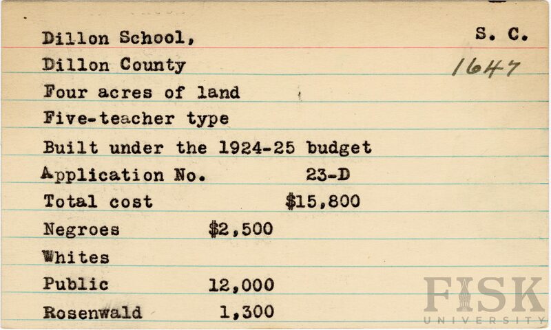 - School card from Rosenwald Fund for Dillon School in Dillon County, South Carolina