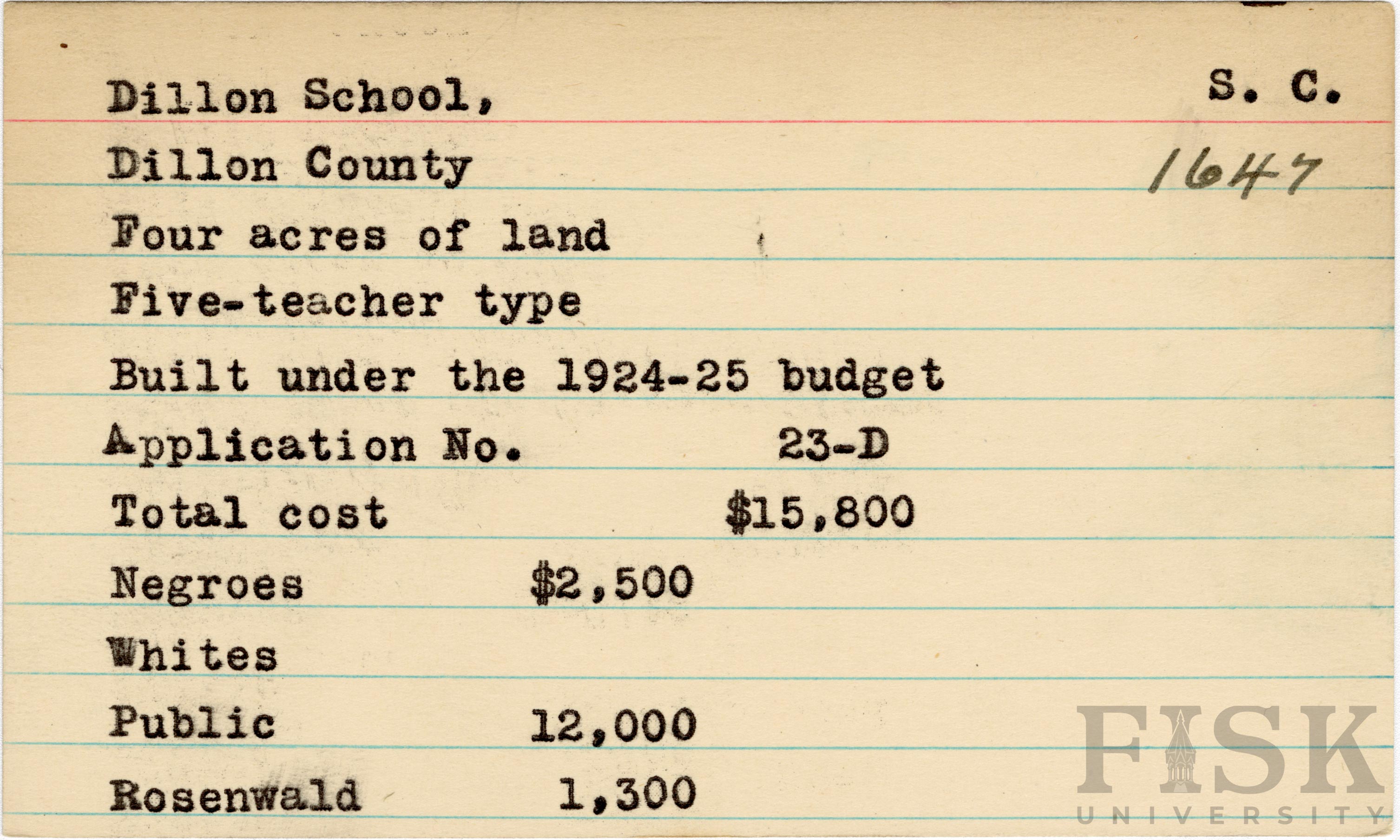 School card from Rosenwald Fund for Dillon School in Dillon County, South Carolina
