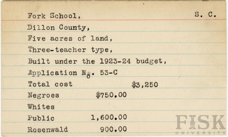 - School card from Rosenwald Fund for Fork School in Dillon County, South Carolina