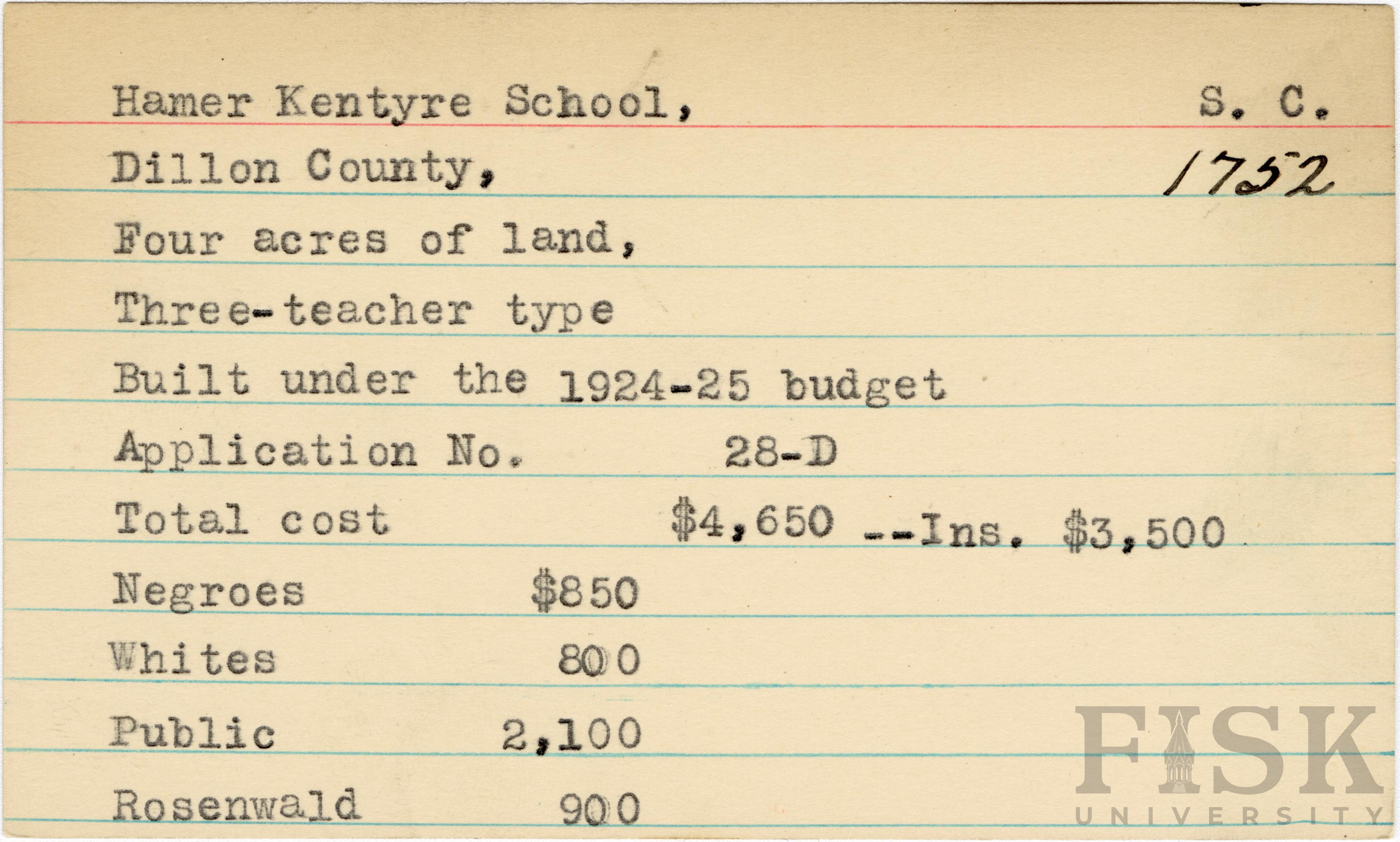 - School card from Rosenwald Fund for Hamer Kentyre School in Dillon County, South Carolina with a section added to the budget contributions that says, "Ins. $3,500"