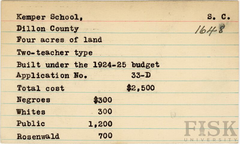 - School card from Rosenwald Fund for Kemper School in Dillon County, South Carolina