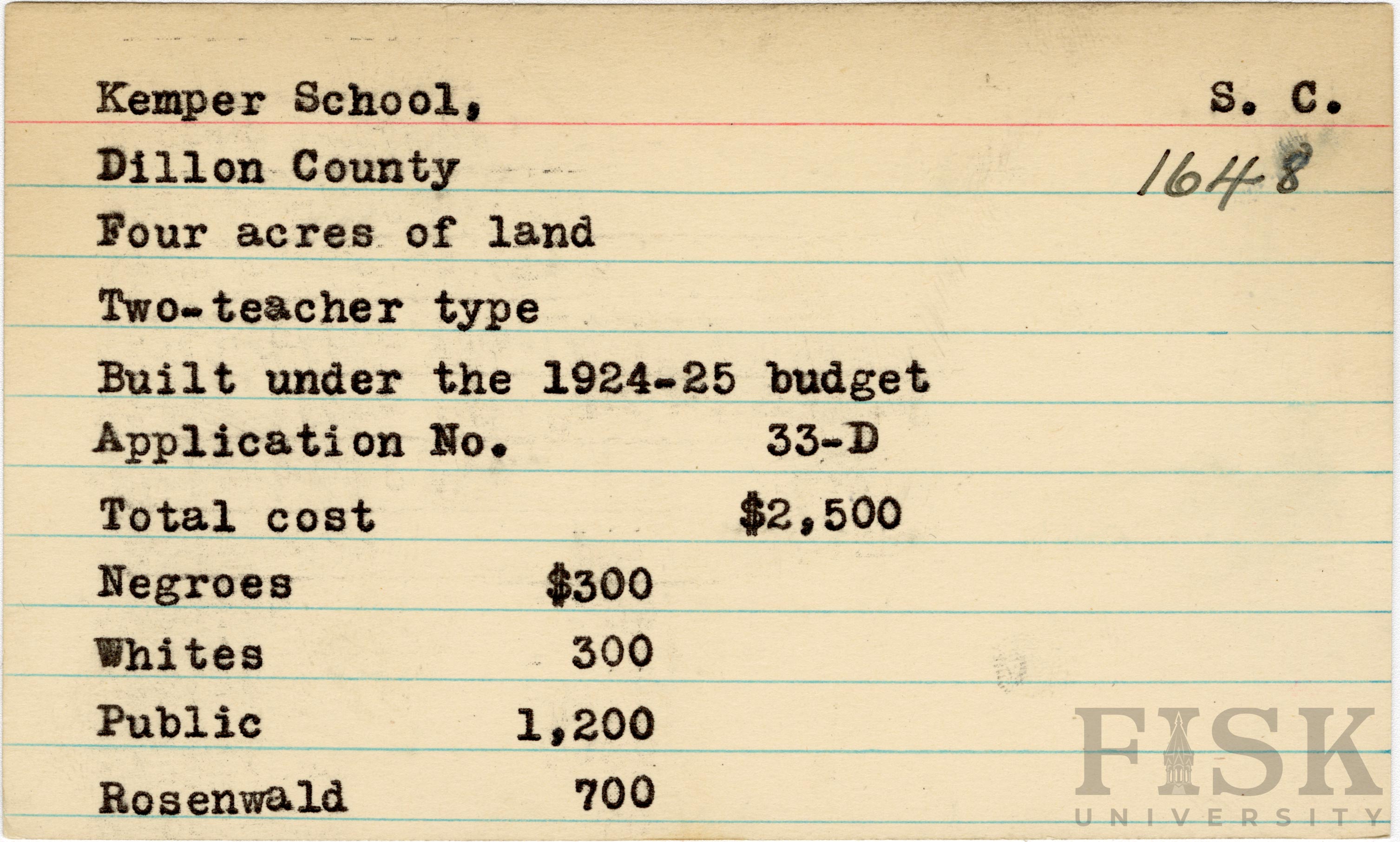 School card from Rosenwald Fund for Kemper School in Dillon County, South Carolina