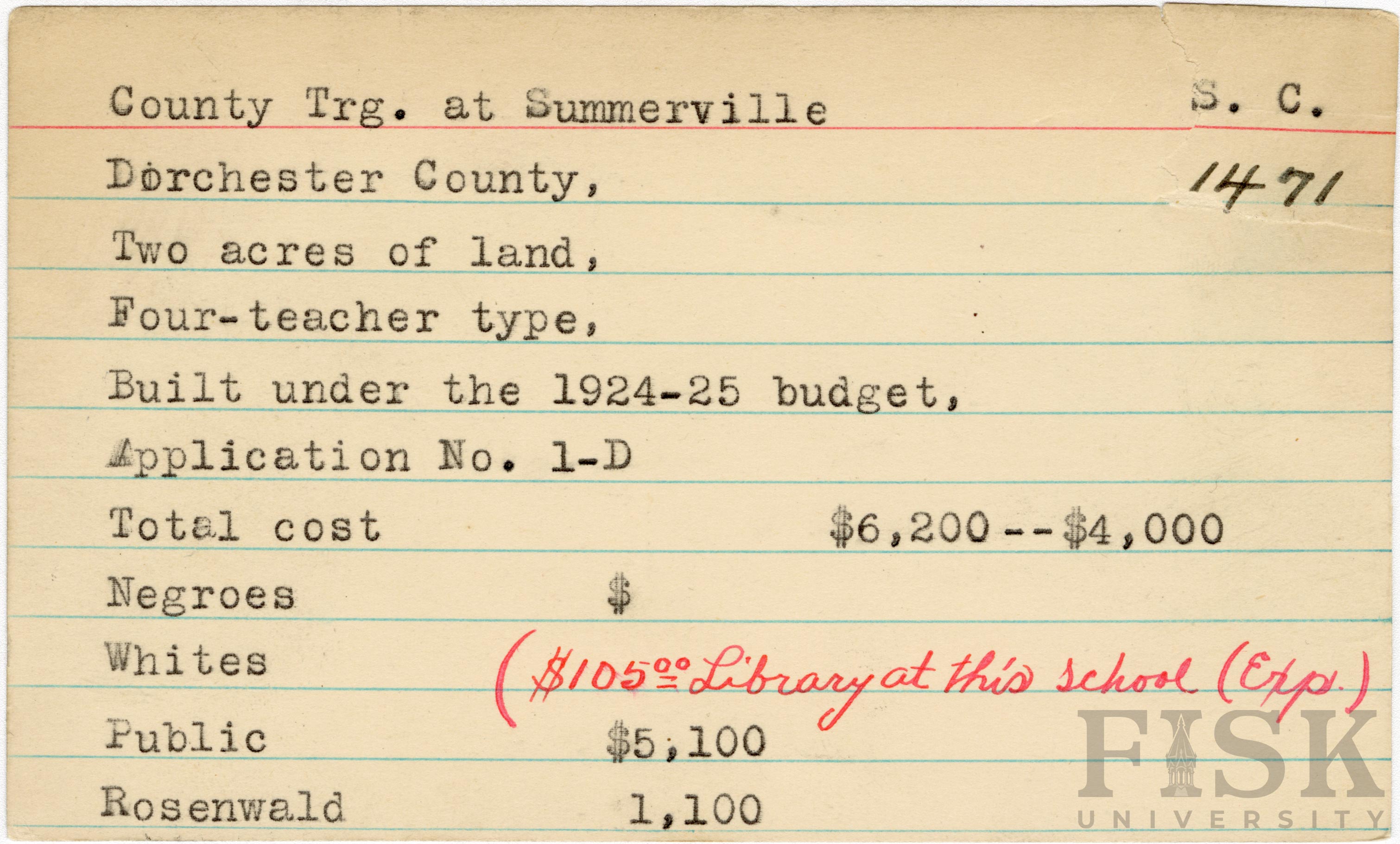 - School card from Rosenwald Fund for County Training School at Summerville in Dorchester County, South Carolina with a section added to the budget contributions that says, "$4,000" and a handwritten note on the card that says, "($105.00 library at this school (Exp)"