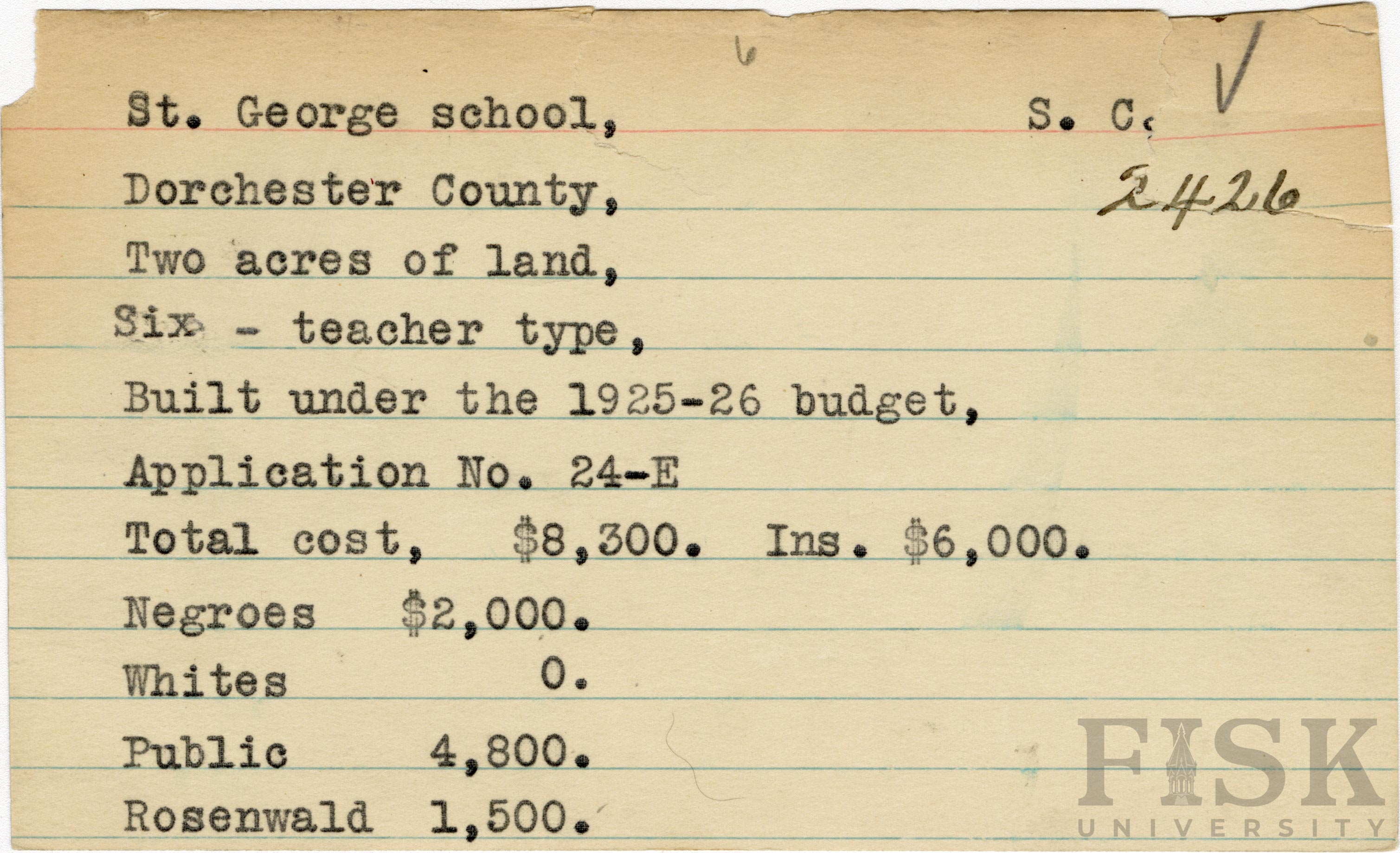 - School card from Rosenwald Fund for St. George School in Dorchester County, South Carolina with a section added to the budget contributions that says, "Ins. $6,000"